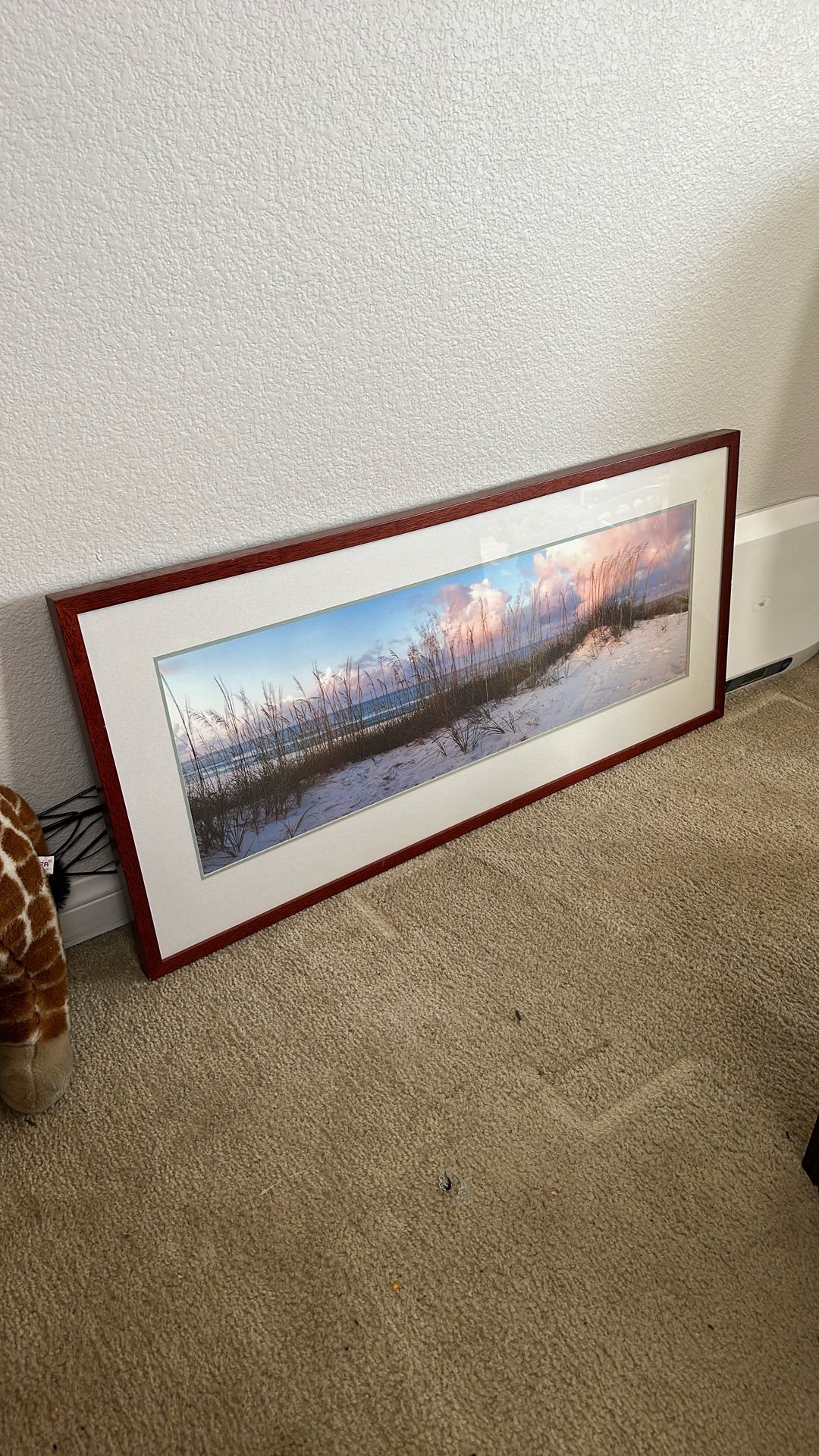 41 x 18.5 inches. Nice quality framed/matted photo of beach with sand and grass.