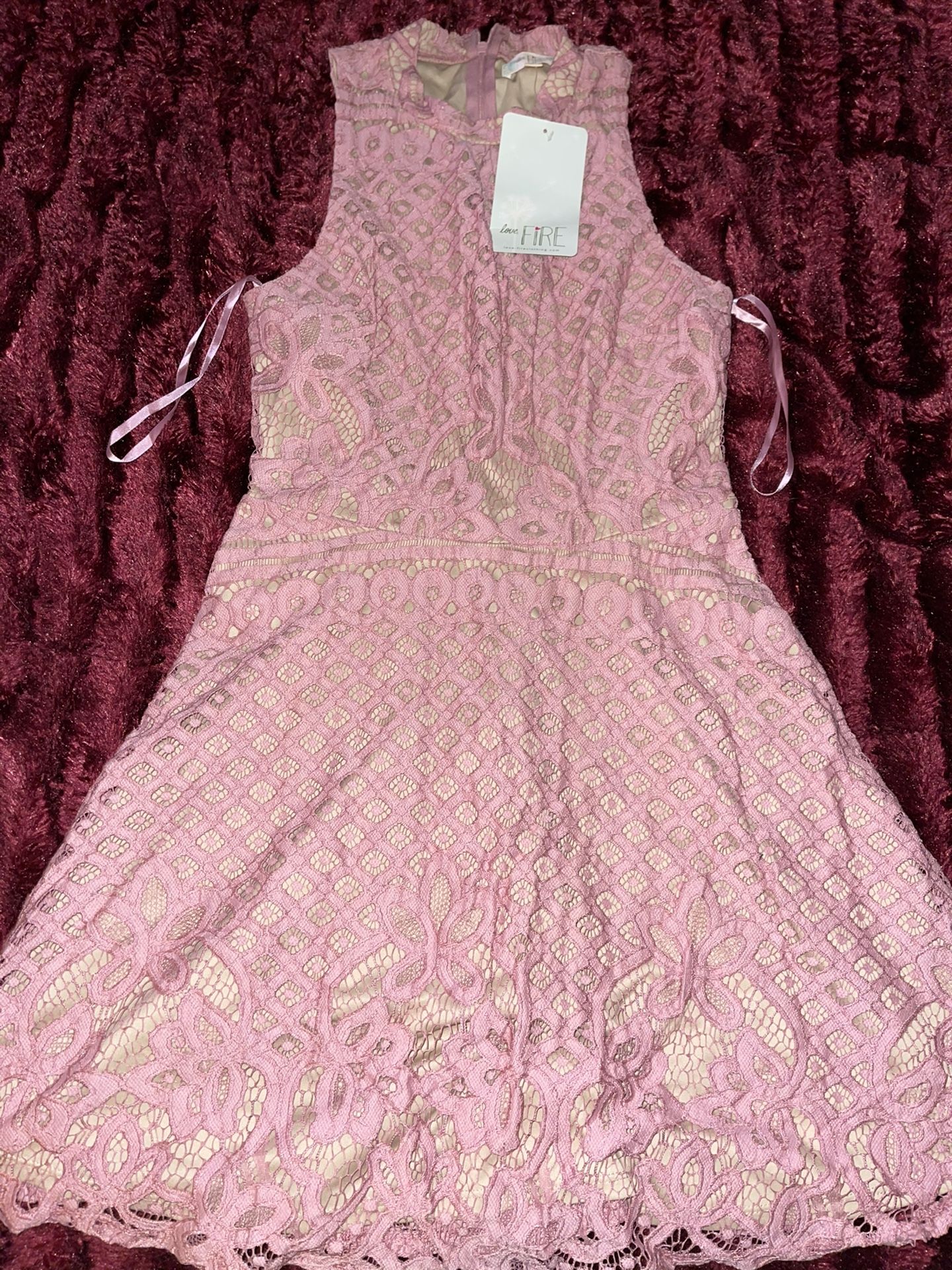 Beautiful pink/blush lace dress. Brand new. Length is 34. Width is 14. No rips/tears. Must pick up/ meet in Bastrop. Pay pal . Final sales. No refunds. Thank you for looking.