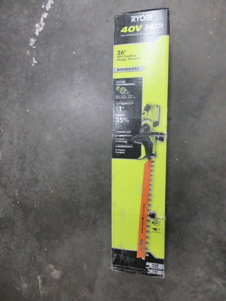 NEW RYOBI RY40640 40V HP Brushless 26 in. Cordless Battery Hedge Trimmer KIT with 2 Ah Battery & Charger NEW IN RETAIL BOX - GUARANTEED TO WORK GREAT! PRODUCT OVERVIEW: With a cutting speed of 3000 strokes per minute, the RYOBI 40V HP Hedge Trimmer delivers GAS-LIKE POWER and longer run time than a gas hedge trimmer. The premium HP brushless motor provides more power, longer runtime, and a longer motor life. The 26 in. blade provides maximum cutting capacity and added reach. The dual action steel blades offer an aggressive 1 in. cutting capacity, all while reducing vibration. Other features include a rotating rear handle for precision cutting at any angle, along with a wrap-around front handle for ultimate control. Featuring the innovative HEDGESWEEP design that clears clippings and debris while you trim. The RYOBI 40V HP Hedge Trimmer, the included 40V 2.0 Ah battery, and charger are all compatible with 85+ RYOBI 40V products. PRODUCT FEATURES: Brushless motor provides efficient clean cuts 26 in. bar for added reach Dual-action blades for reduced vibration Up to 1 in. cutting capacity Rotating handle for trimming at all angles HEDGESWEEP debris remover clears clippings while you trim Anti-jam technology for speed and efficiency when cutting RYOBI 40V 2.0 Ah lithium battery and charger included Works with all RYOBI 40V lithium batteries