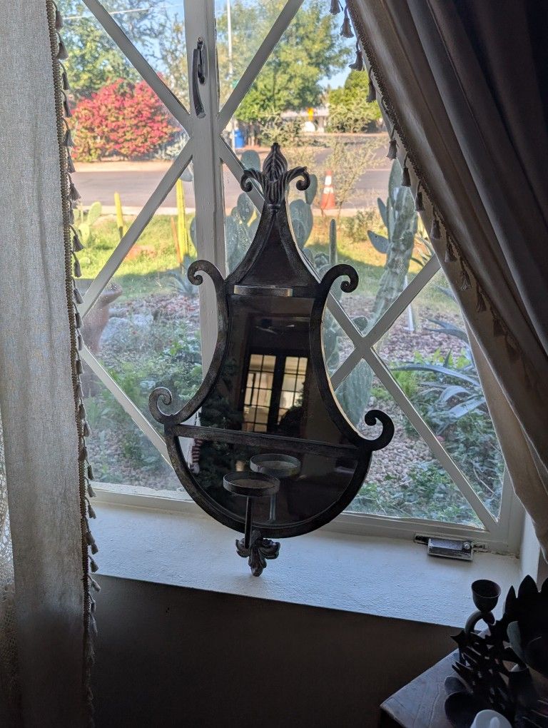 Antique silver mirror with candle holder and room for a plant. Heavy and in great condition. Has a hook to hang on wall. Beautiful addition to a garden room or bedroom.