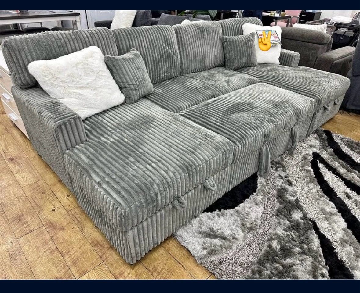 👇New. U-Shaped Pull Out Sectional Sofa w/ Storage Chaises w/ USB + Pillows SECTIONAL Size: 123.03 x 62.01” (each chaise)x 36.02 in. H FEATURES: • Corduroy Fabric Upholstered U-Shaped Sectional Sofa Bed • Convertible Pull Out Bed • Spacious Storage Chaise • Comfortable Square Armrest with Magazine Rack and Wireless Charger • Easy to charge USB Ports • Stainless Steel Cupholders • 6 Throw Pillows Included 8(contact info removed)