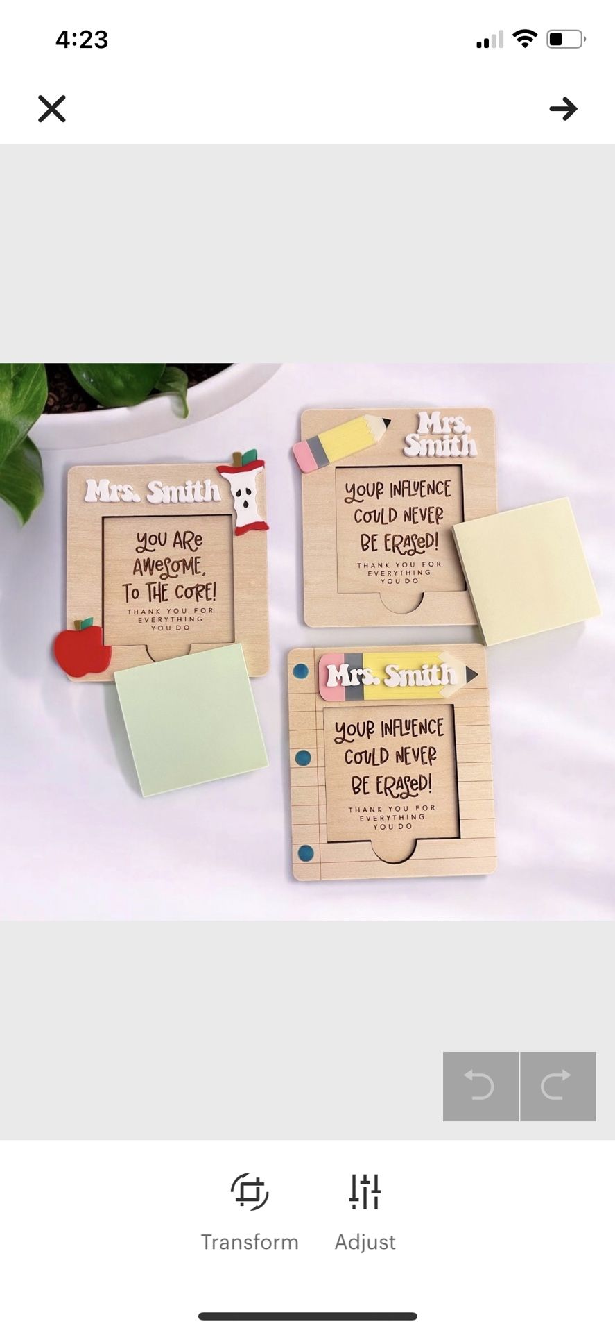 Wooden post it note holder personalized with teachers name. 3 styles to choose from. Comes with 1 sticky note pad