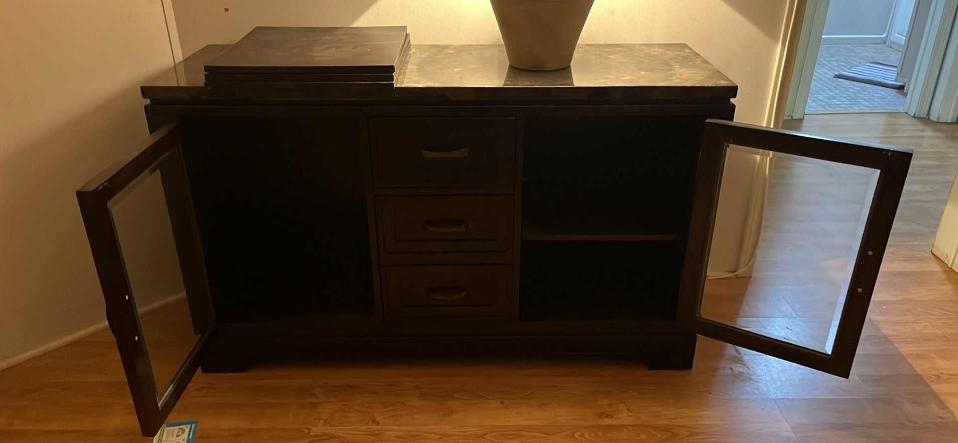 Console table wood with marble top. 2 cabinets with shelves and 3 drawers