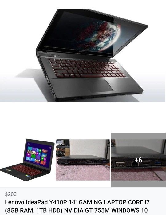 Hello! You Can Buy With Confidence. I'm a Highly Rated/Trusted 5-Star Seller KENDOTRONICS. READ MY 3000+ GLOWING REVIEWS! See Kendotronics dotcom. All products are tested and come with a 14-day warranty! **more pictures available upon request** Lenovo IdeaPad Y410P 14" GAMING LAPTOP INTEL CORE i7-4700MQ (8GB RAM, 1TB HDD) NVIDIA GT 755M WINDOWS 10 GREAT GAMING LAPTOP PC - FOR THE GAMING ENTHUSIAST! PERFECT STARTER LAPTOP FOR GAMERS AT A BUDGET PRICE! FOR GAMING, BUSINESS, GRAPHIC DESIGN, CODING, MUSIC EDITING NEW BATTERY & CHARGER IS INCLUDED Brand Lenovo Series IdeaPad Model Y410p Processor Intel Core i7-4700MQ Processor Speed 3.40 GHz RAM Size 8GB HDD Capacity 1TB Screen Size 14 in GPU Nvidia GeForce GT 755M Graphics Processing Type Dedicated Graphics Most Suitable For Gaming Type Notebook/Laptop Connectivity Wi-Fi, Bluetooth, Gigabit Ethernet, HDMI, USB 3.0, VGA, SD Card Slot Operating System Windows 10 Pro Features DVD-RW, Gigabit LAN, JBL Speakers, Backlit Keyboard, Bluetooth, Built-in Microphone, Built-in Webcam, Optical Drive, Widescreen Display, Wi-Fi, Nvidia Graphics, Intel Core i7 76YU100983Q SN-YB01093648
