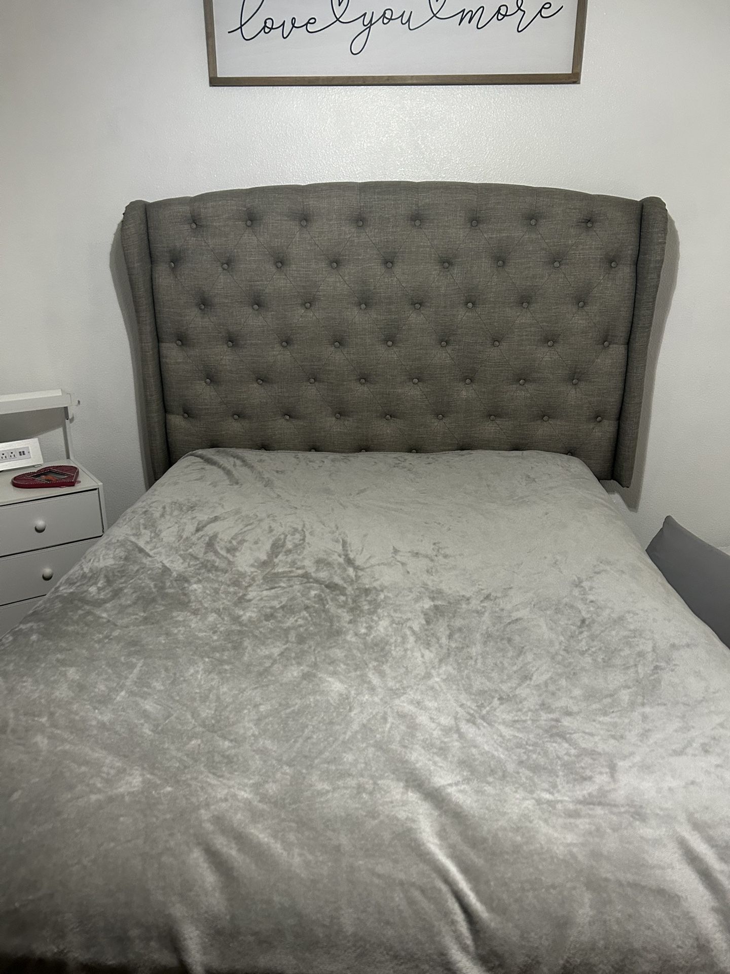 Grey fabric queen size bed frame. Bought from Ashley furniture. Well taken care of. Mattress and box spring not included. Must pick up. Asking $140 OBO.