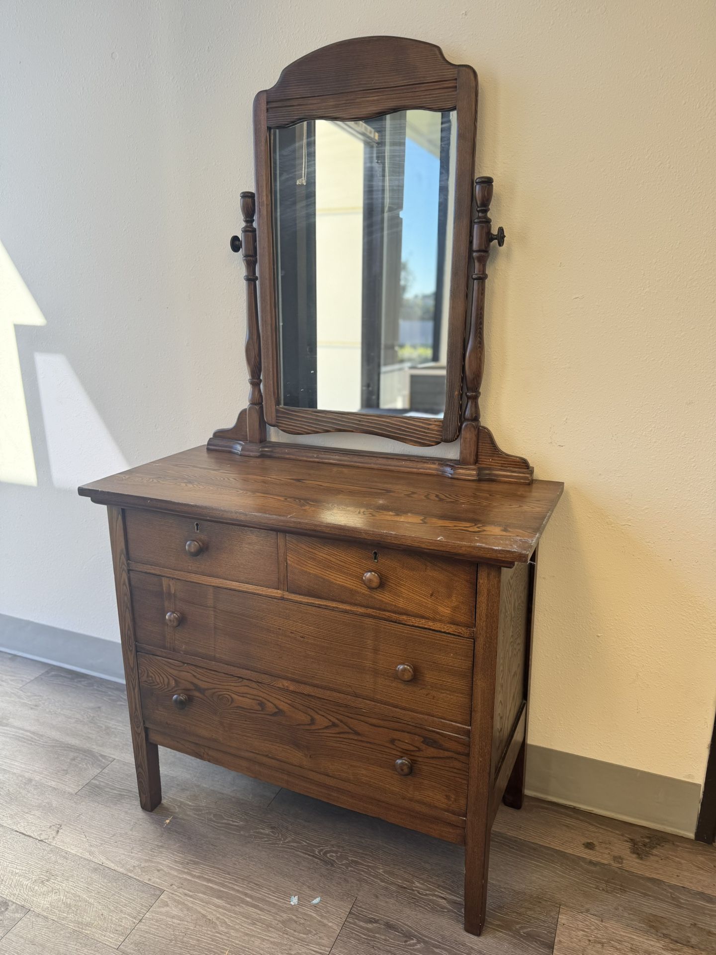 Antique Solid Oak Dresser with Original Swing Mirror (c. 1908–1912) Price: $495 OBO Location: Oceanside, CA Pickup only Description: Authentic early 20th-century American oak dresser with original swing (tilting) mirror and original cast-metal mirror adjustment knobs. Solid wood construction throughout. Pre-WWI, not a reproduction. Construction and details: • Circa 1908–1912 • Solid oak with rich grain • Original swing mirror with turned supports • Original cast-metal mirror knobs • Machine-cut dovetail drawers (period correct) • Solid wood drawer bottoms (not plywood) • Original wooden drawer knobs and keyholes • Sturdy, tight, and fully functional Condition is very good for its age. Minor surface wear consistent with over 100 years of use. Mirror is original and intact. Ideal for bedroom, guest room, or entryway. Fits Craftsman, farmhouse, traditional, or eclectic interiors. Pickup only in Oceanside, CA. ⸻ Expected Value Ranges • Local private sale: $500–$550 • Antique shop resale: $650–$900 • Curated online marketplaces: $750–$1,100
