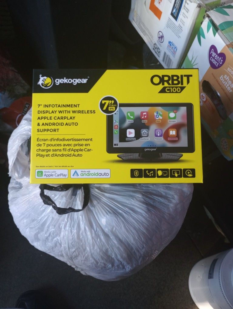 7" display 2 mounting types for your dash or window works with apple car play or android auto support. Used only one time it has games on it also blue tooth voice commands phone and music