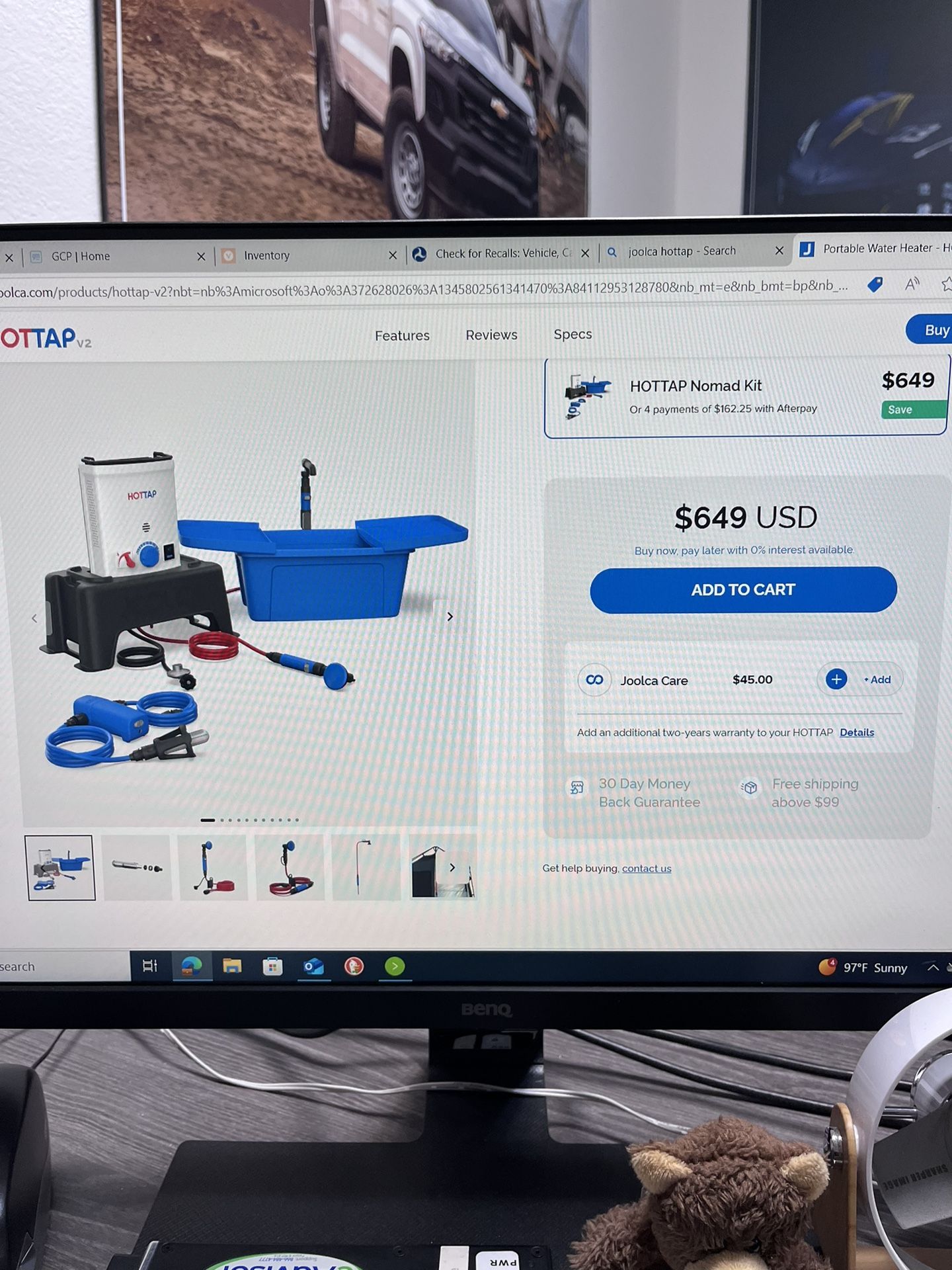 On demand hot water shower and wash basin for doing dishes , shower base recirculates water through filter for endless showering with only two gallons of water Brand new in the box