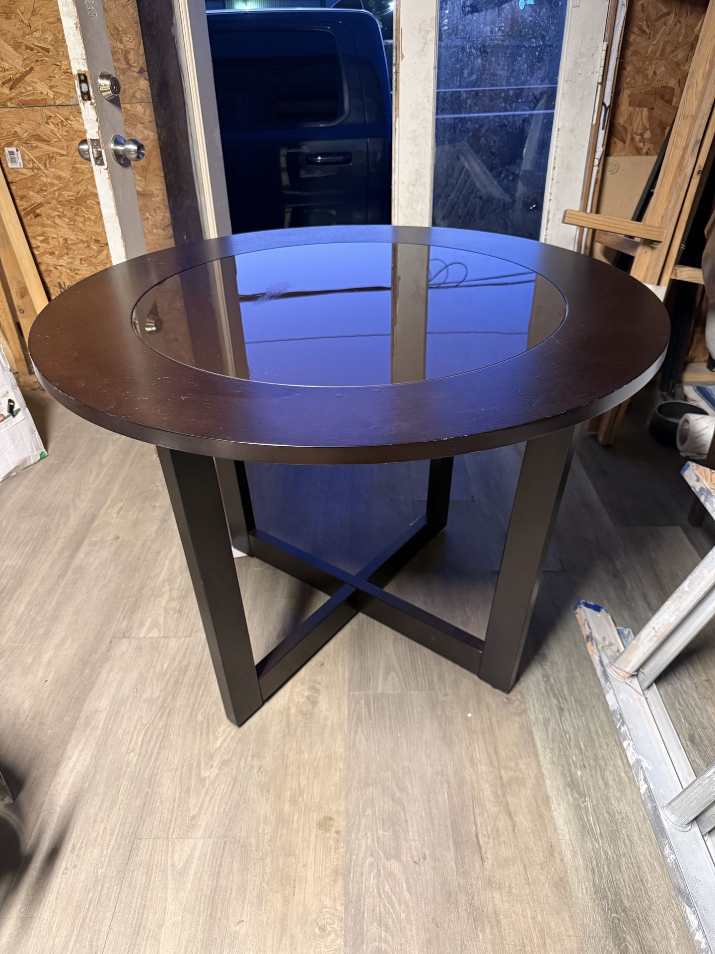 Round wood dining table with top glass , in excellent condition, just table , no chairs available, nothing broke or crack but has some minor cosmetic details just as in the pics . H:30” W/D:42 Delivery available for an extra fee.