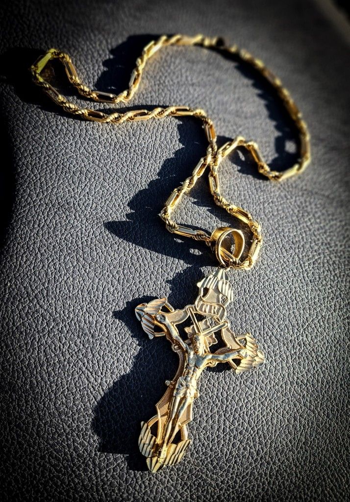 18k necklace 44g and the cross weight 21g the cross 14k gold u won't find a better deal then this chain the clasp has bent with a few minor marks but I bent it back you may just need to get it polished down.