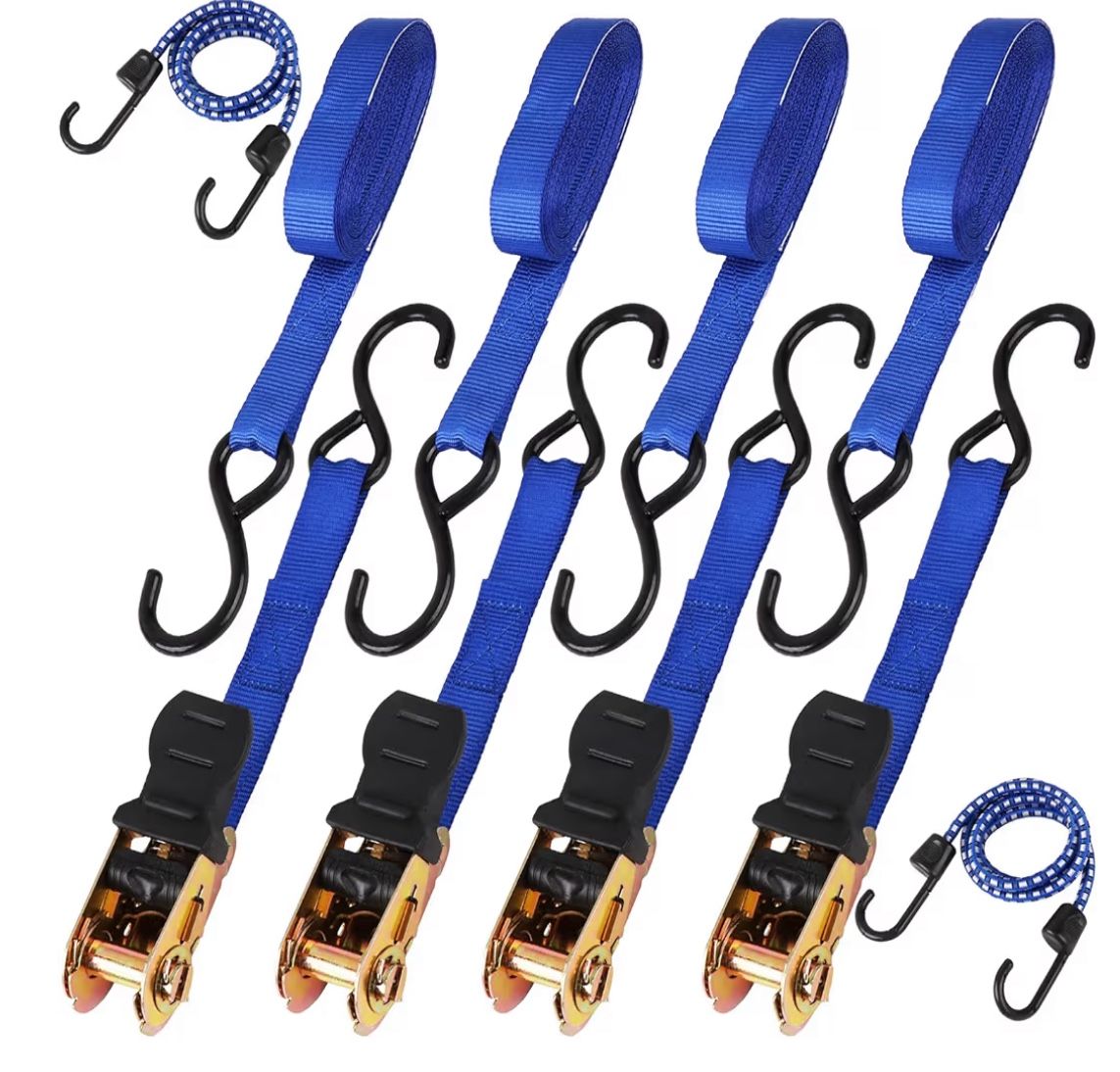 15-Foot Ratchet Belt Fastener Provides Durable, Reliable Security For Transporting a Variety of Items. Securely Fasten Motorcycles, Bicycles, Kayaks, UTVs, Boats, ATVs, Boxes, Boats, Coolers and Oher Cargo by Trailer or Roof Rack. Shoulder Straps are Reinforced with Premium Materials and Stitching to Maintain Unbreakable Ductile Strength Even When Loaded in High Winds and at High Speeds. Each Ratchet Strap has a Load Capacity of 733 Pounds and a Breaking Strength of up to 2,200 Pounds. Heavy Duty S-Hooks Hold Your Stuff in Place. The S-Hooks are Coated with Rubber to Increase Weather Resistance and Prevent Paint From Peeling. Easy to Grip Ratchet Mechanism Provides Excellent Control, Comfort and Hrip. Quick Release Latch, Quick Fastening. 1 "Flexible Webbing can Immediately Adapt and Lock Into Place, Ready to Unload, Pull the Black Spring Loading Handle to Achieve a Smooth, Fast Release. Ldeal for Porters, Landscapers, Boaters, Extreme Sports Enthusiasts, Campers, Construction, Tree Removal and Traction. Contains 4 Heavy duty ratchet buckles, 4 heavy-duty hook straps and 2 Bungee Cords for Securing Tools, Accessories & other Loose Retails for $5 each Have 6 available at $2 each Very good condition; only used once Cash and pickup only