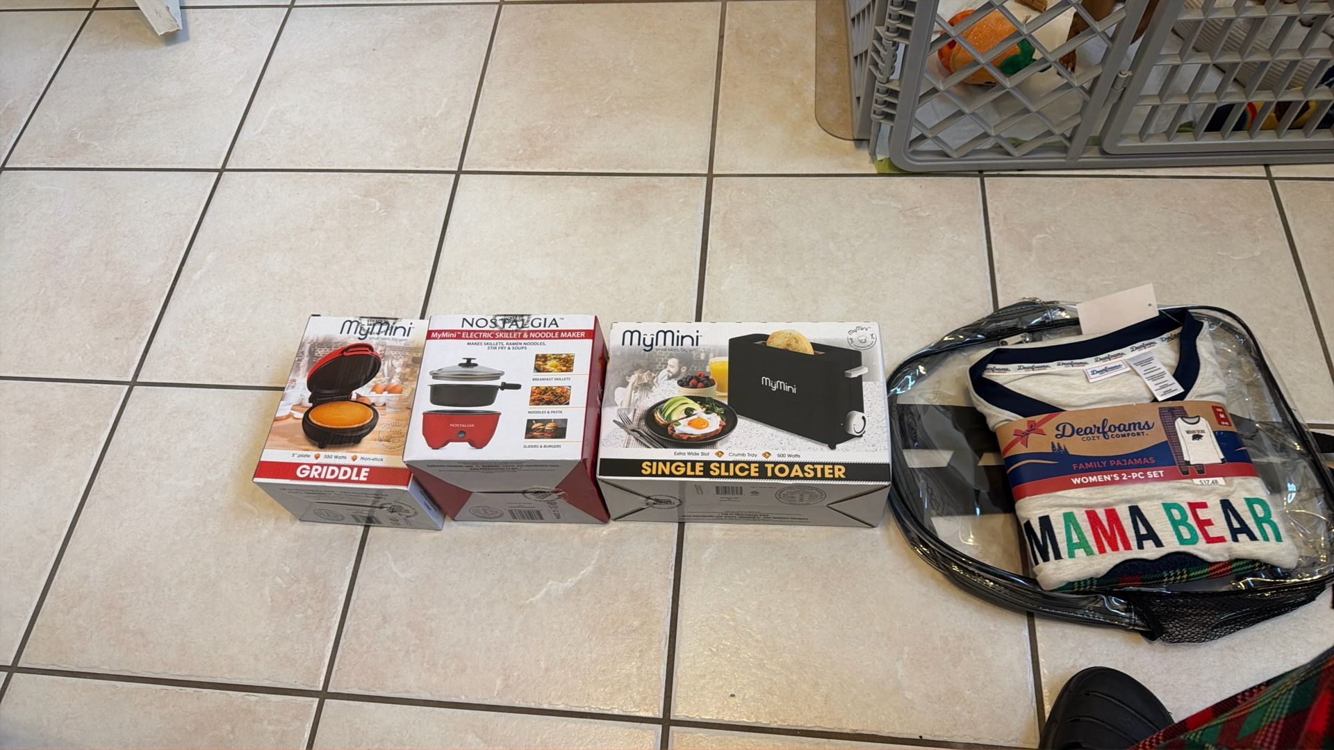 Make mini pancakes on a griddle, Electric Skillet makes ramen noodles stir fry and soup, single bread toaster, and pajama 2 pc set med size.