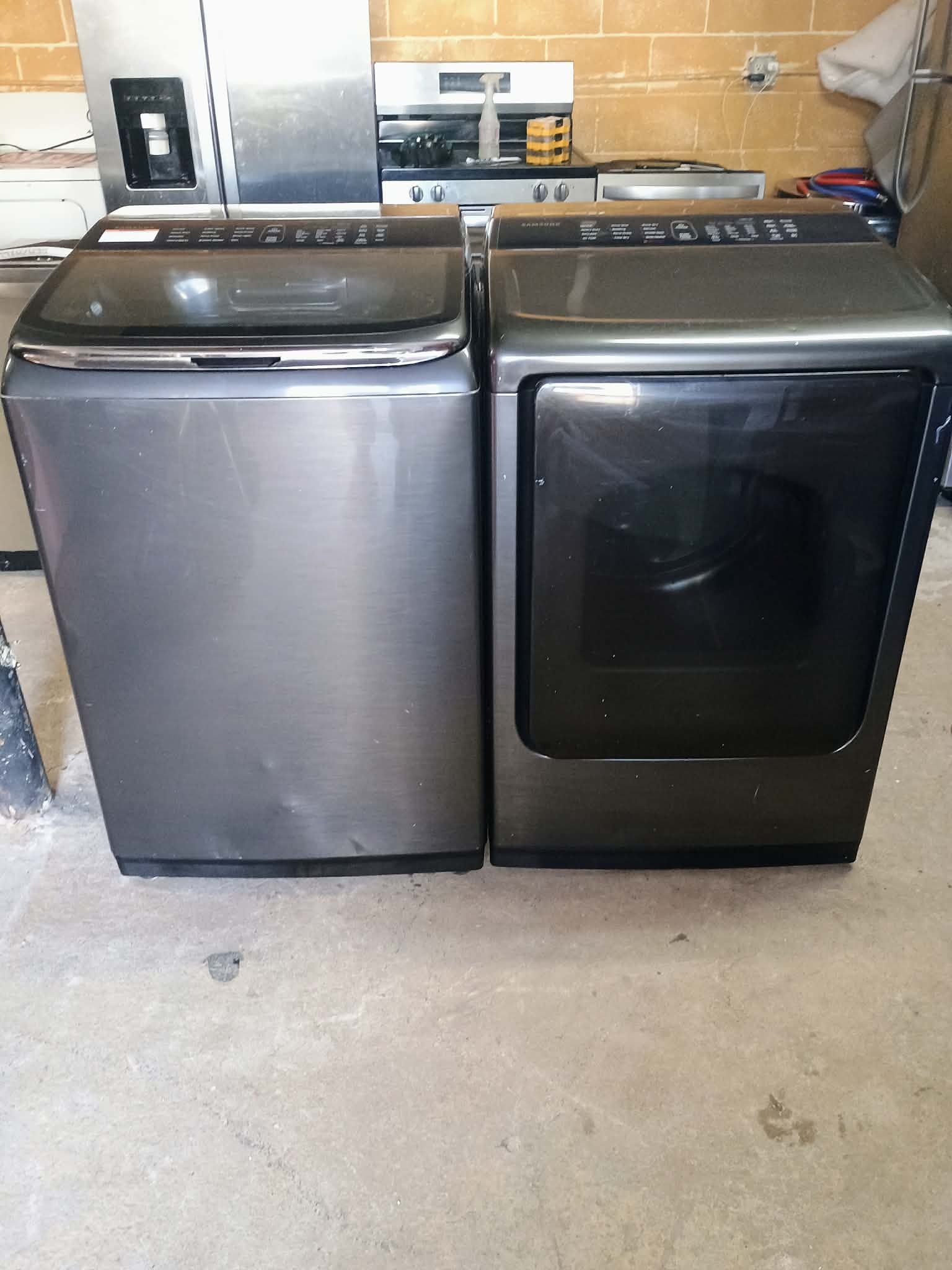 Sleek Samsung washer and dryer set. Dark grey color. Washer is a top-loader and dryer is a front-loader. Great for laundry day. Delivery and installation is available 🖤hmu ‼️