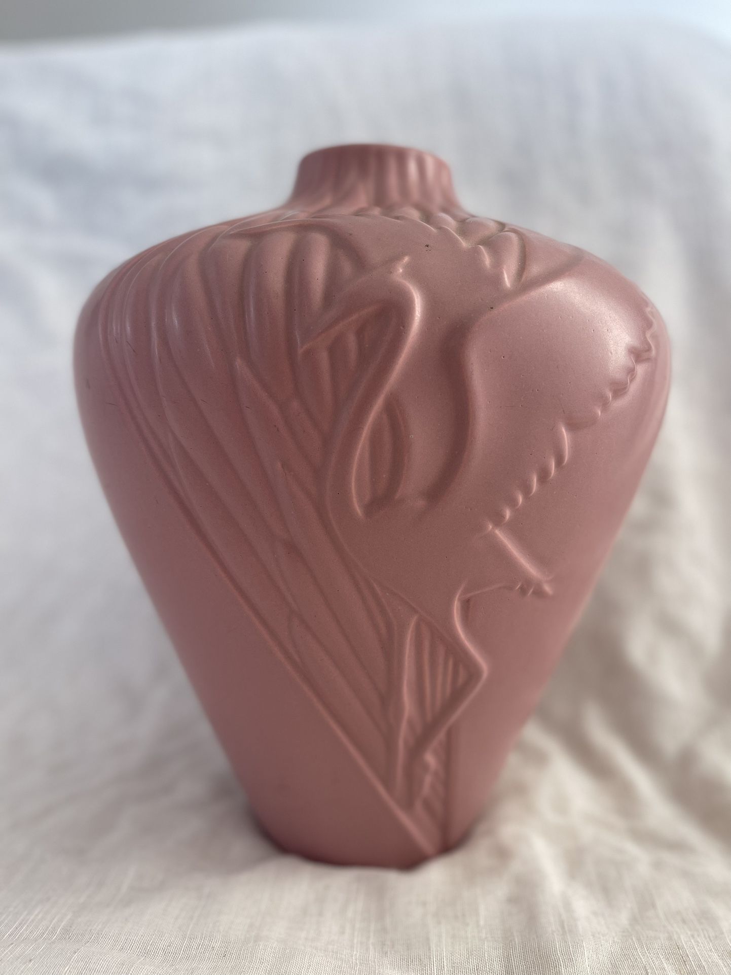 Vintage Blush Colored Large Haeger Pink Crane Vase, 1986. Approximately 12”tall 9” Small chip on the back side rim. PPU SHIPPING AVAILABLE