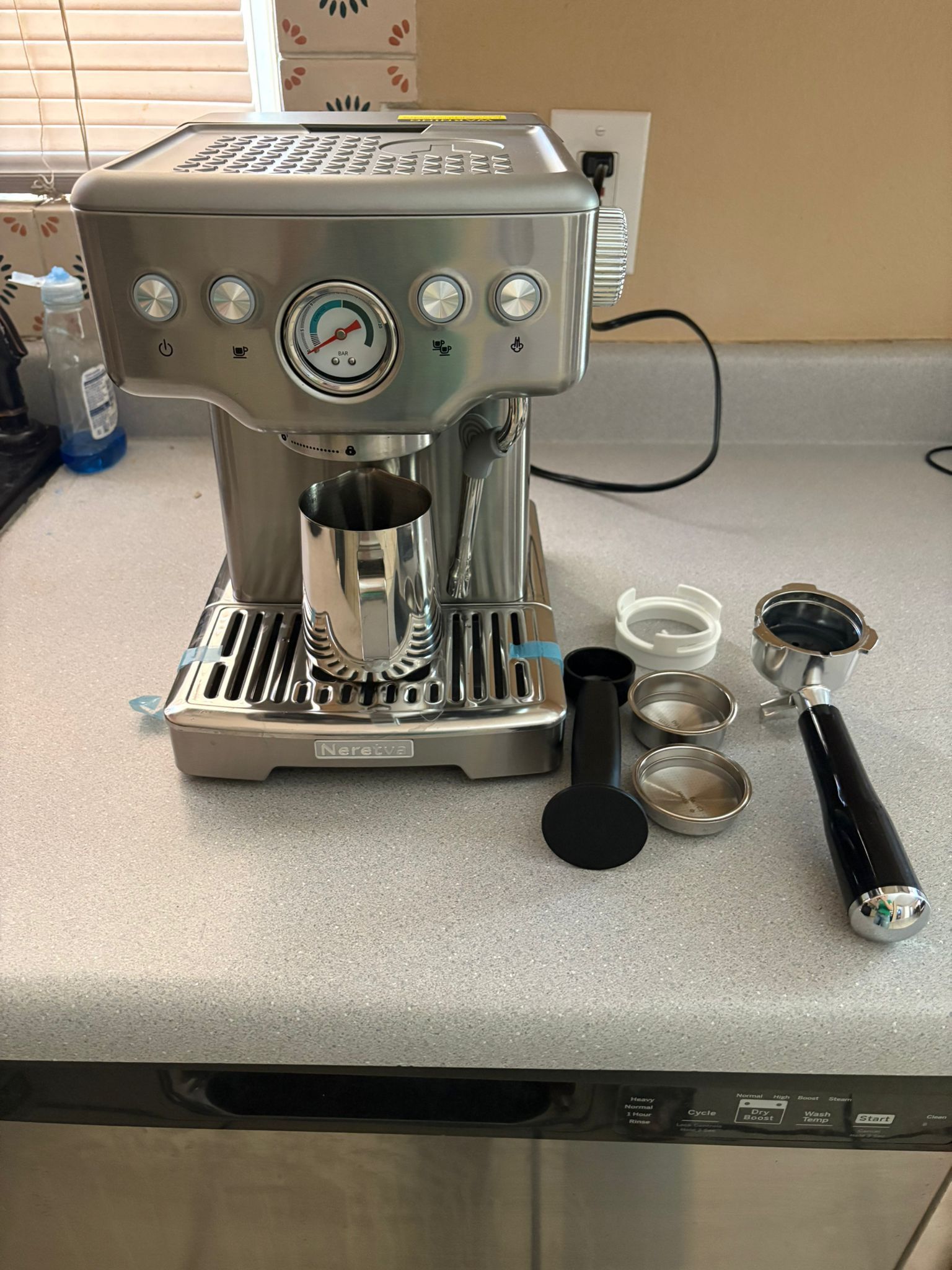 Brand new Neretva espresso machine. Can make single or double cups with just a click of a button. Comes with a milk frothing pitcher dosing funnel 2 cup filter 1 cup filter spoon and a 51mm portafilter