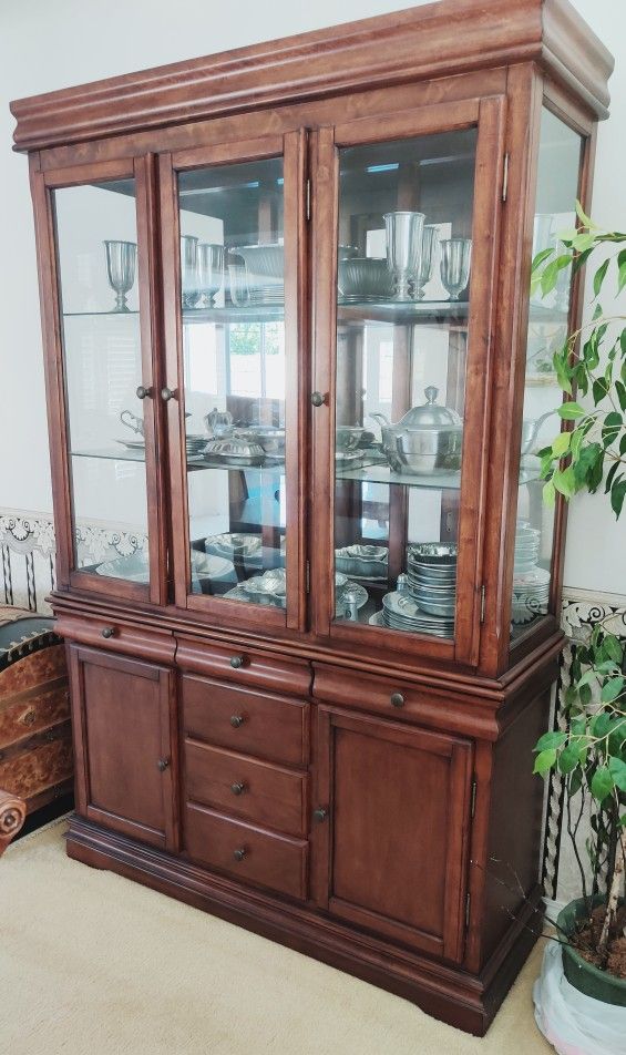 Gorgeous china hutch. Glass shelves, velvet lined drawers and lots of storage space. 52"wide x 17"deep x 80" tall Ask when you can pick up.