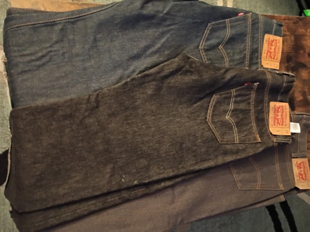 Two pair of dark blue two pair of black one dark gray sizes 34x32 and 36 by 30 used