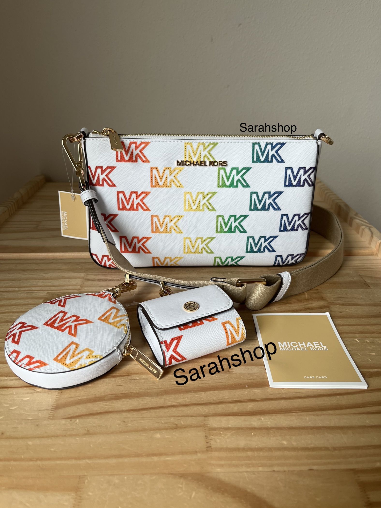 100% Authentic Brand new with tags Jet Set Travel small crossbody Attachments coin zip pouch and AirPods case Optic white multi and gold hardware Approximate Measurements Purse: 9.5”bottom L x 5.5" H x 2.5” D Coin pouch: 3.5” L x 3.5" H AirPods case: 2 3/4” L x 2.5” H Adjustable strap