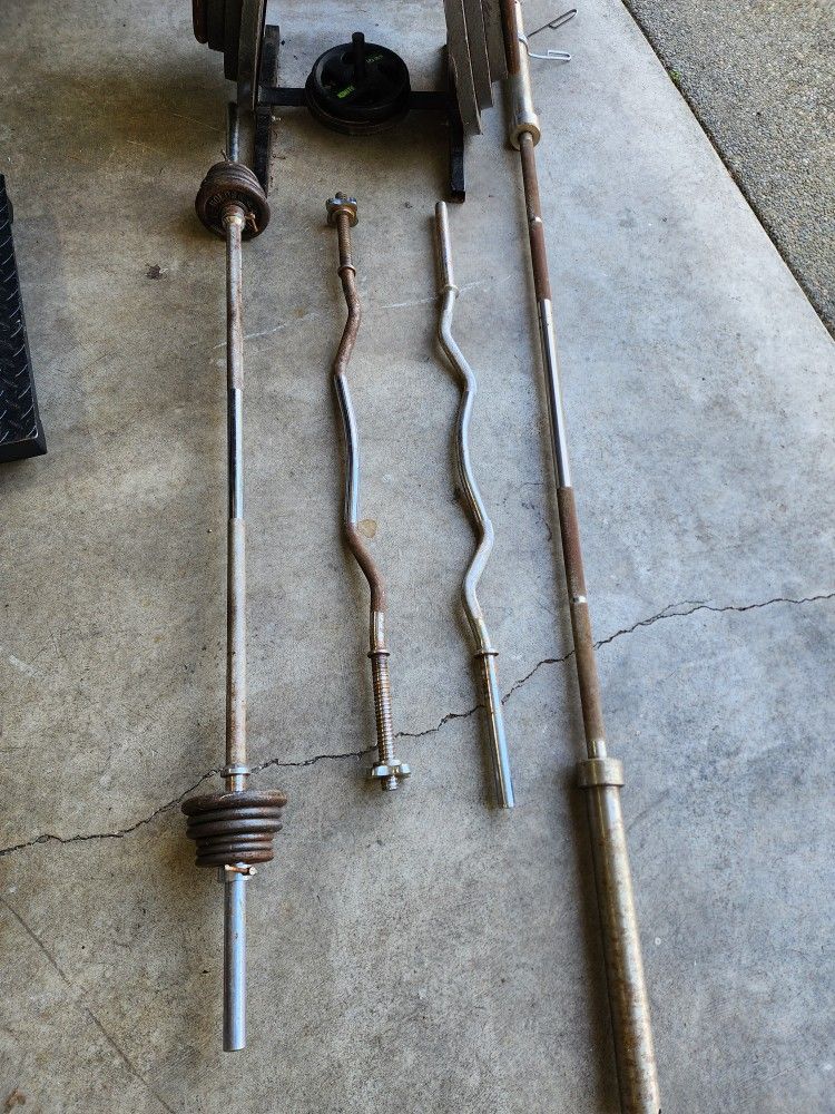 Selling the whole set 2- 45ll 2-35lb 4-25lb 2-12.5lb 2-1lb 2-5lb Plus 14 random weights 4 bars