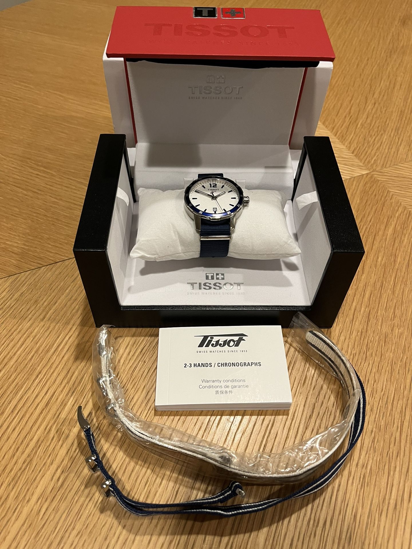 Tissot Quickster Blue White Nylon Strap Swiss Quartz Watch T0(contact info removed)03701 40 MM New battery Includes all three Nato straps