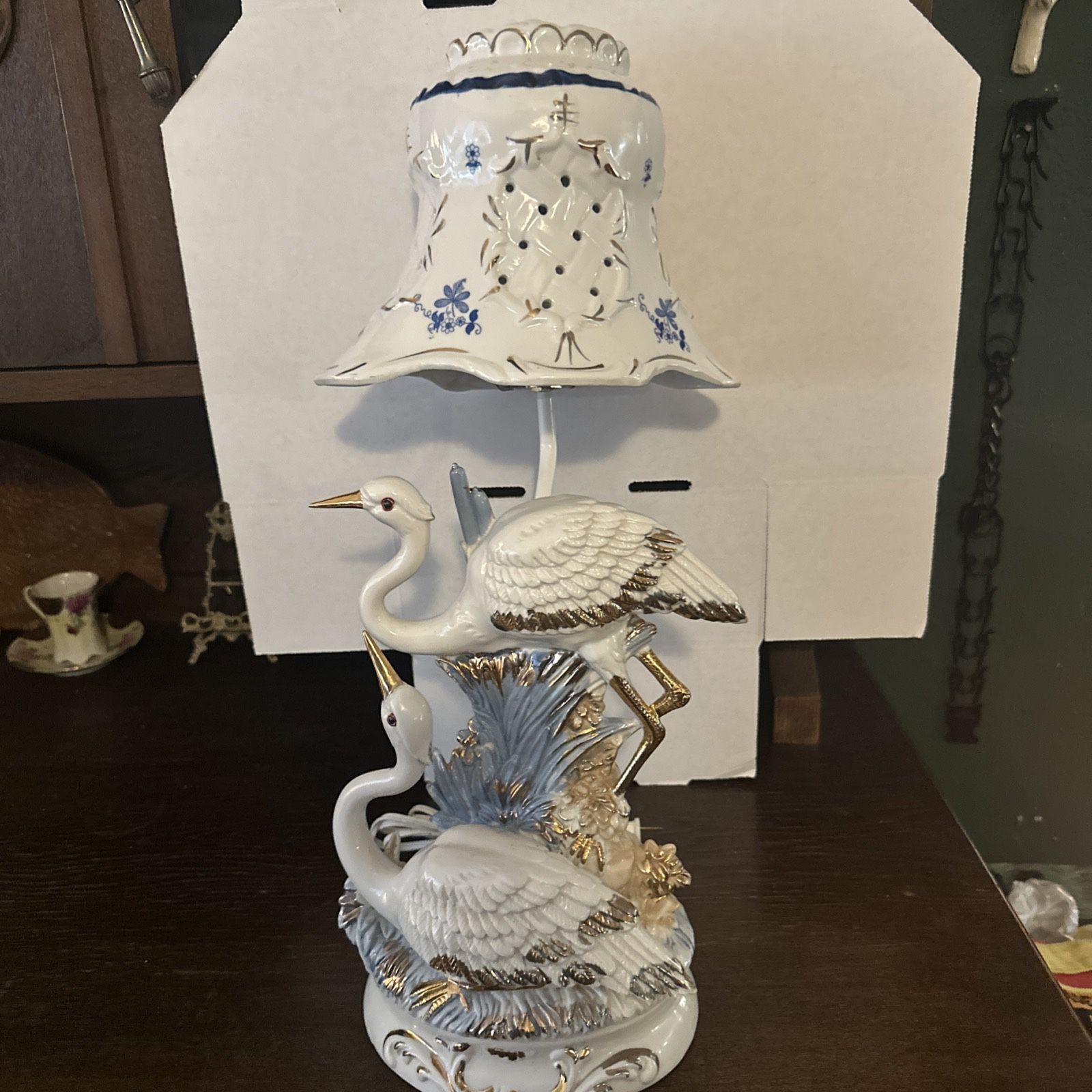 Vintage Porcelain Crane Lamp Shade Victorian Blue & White Gold Edging Romantic beautiful lamp!