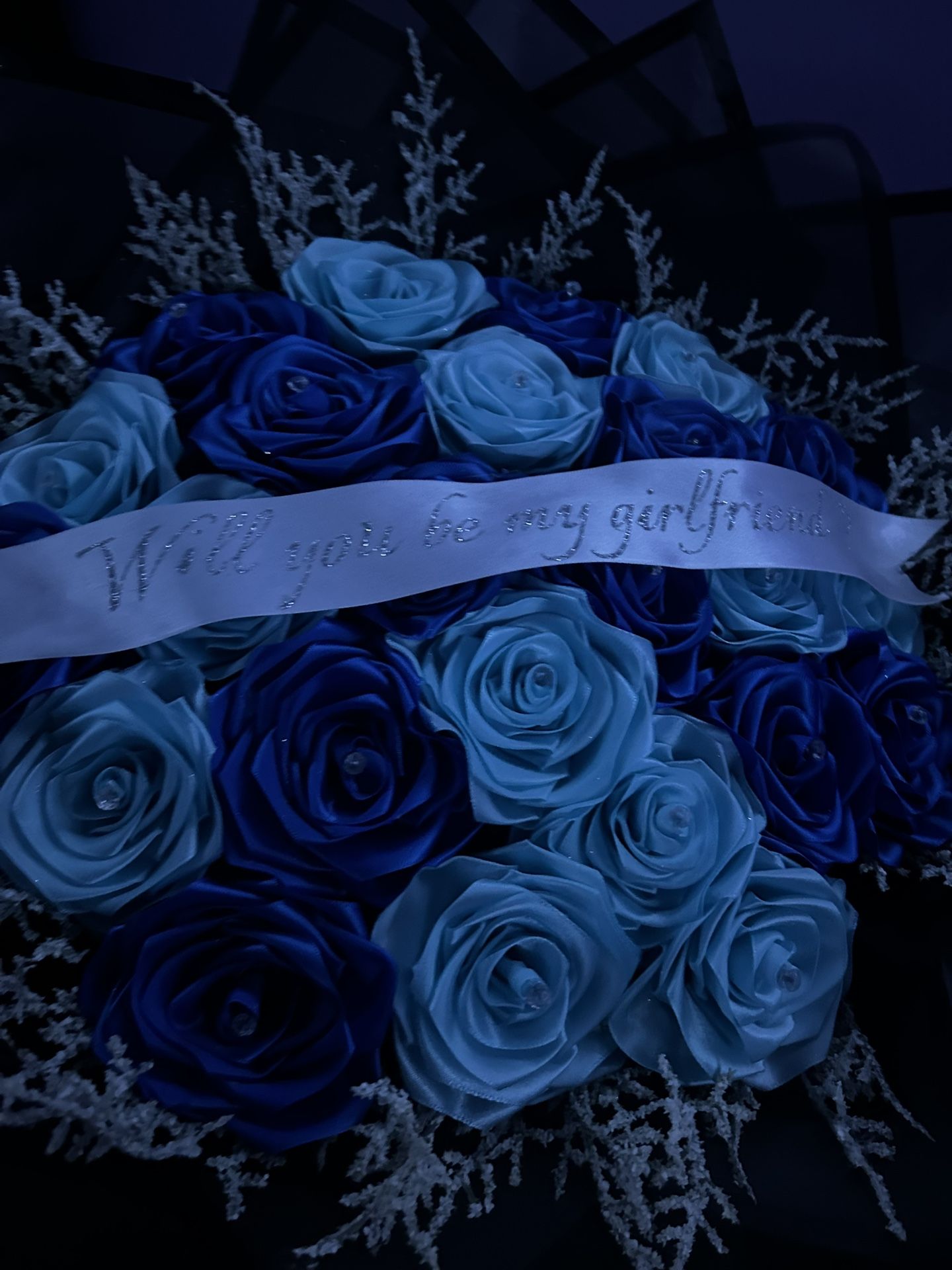24 count roses light blue and dark blue black korean paper and white ribbon “will you be my girlfriend”