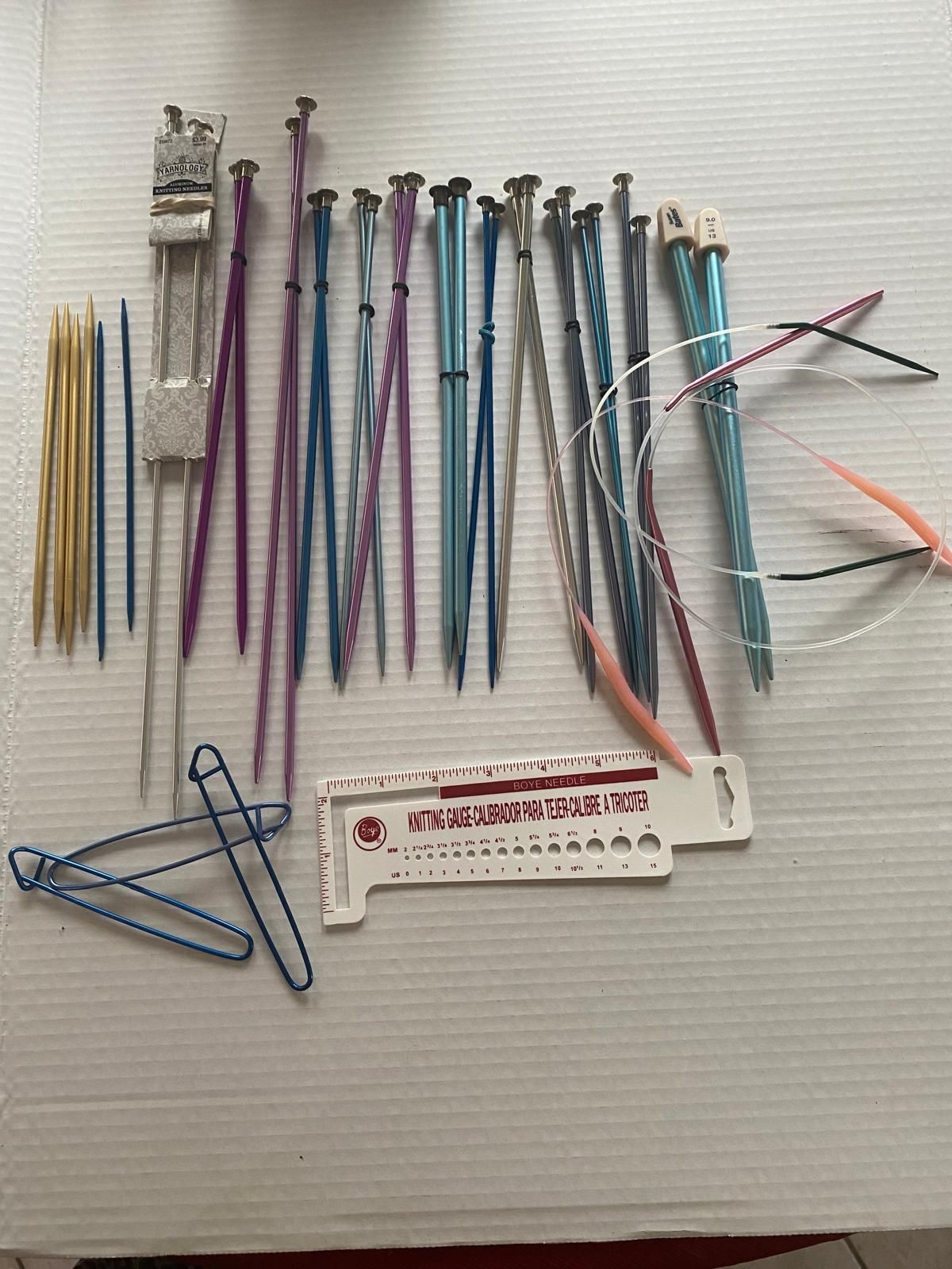 Selling the bundle! 13 knitting needles plus 6 double side needles, 3 knit holders and one gauge- calibrator.