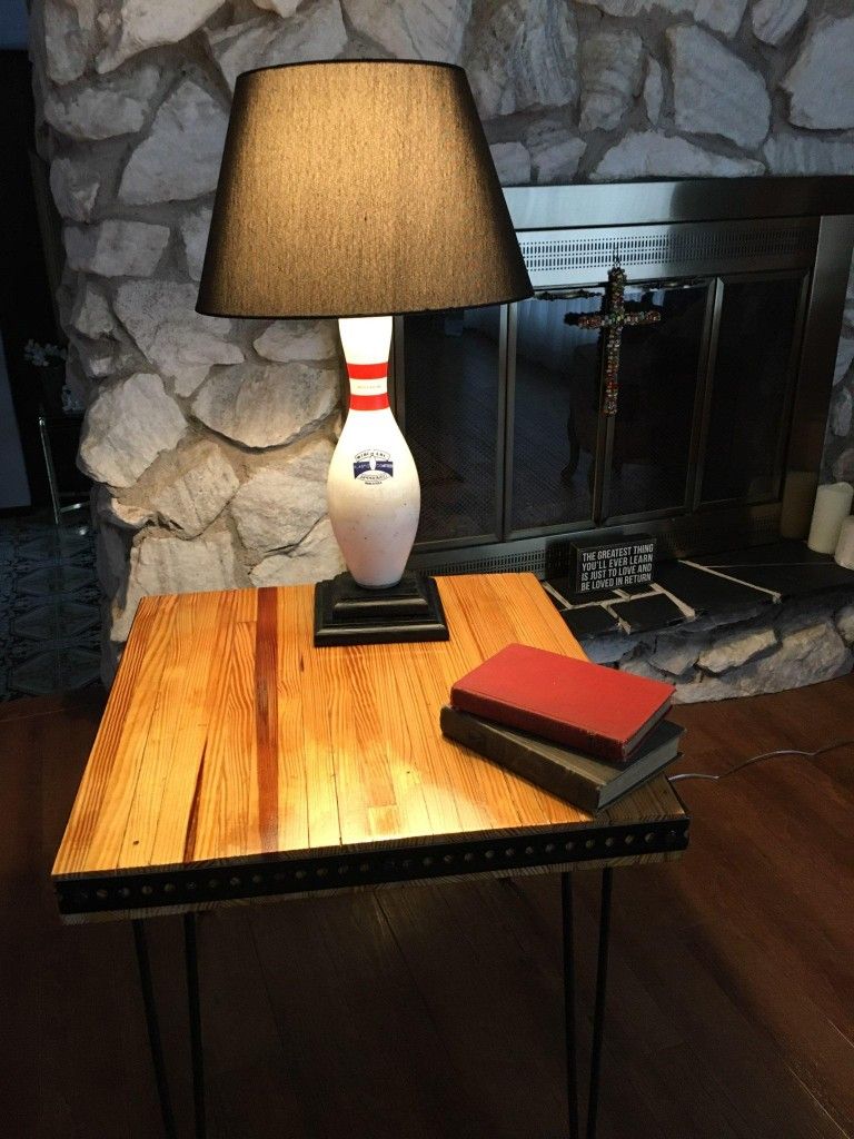 Free local delivery. Beautiful wood table made from the lanes of an authentic bowling alley. Excellent woodwork and craftsmanship. 2 tables and 2 bowling pin lamps available. Great for the man cave, fathers/mothers day gift. Measures: End table 24x23x21h, larger bar/end table 30x22x21 lamp is 26" tall, made from a real bowling pin and handcrafted wood base. Price: 119 lamp, medium table 175 big table 220 Can pickup or have delivered for small fee.