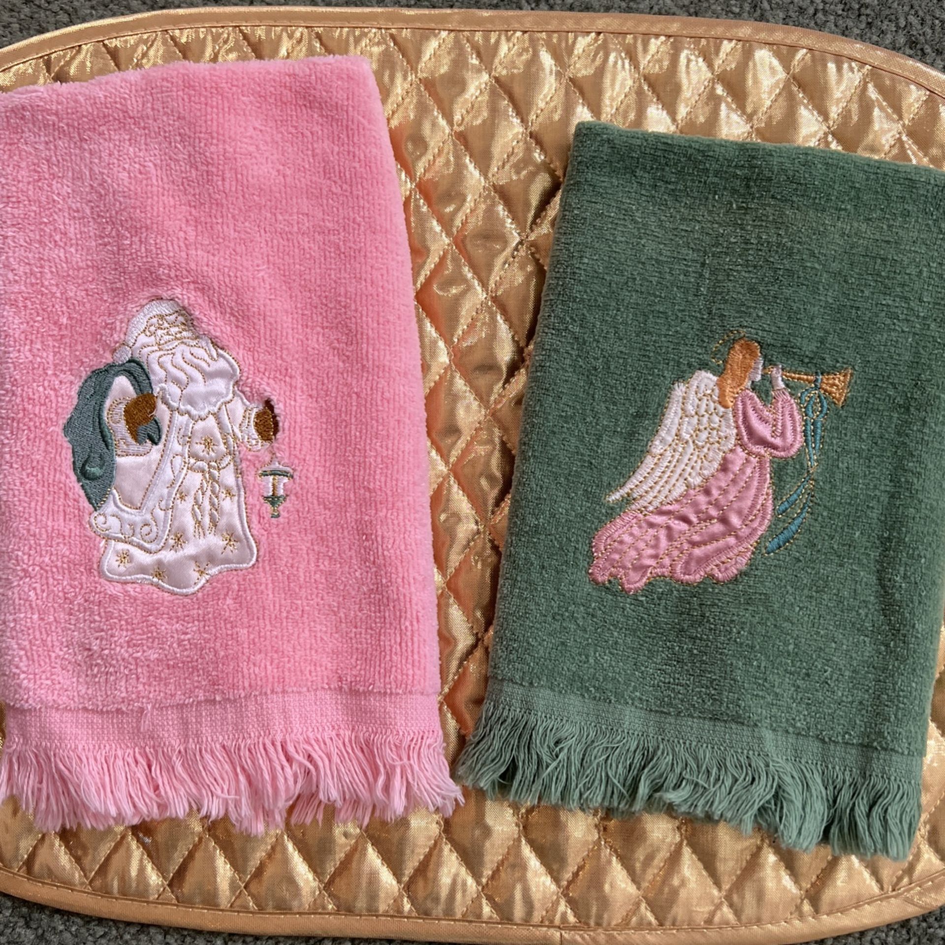 Gently used, vintage pastel set of 2 Christmas holiday fingertip towels; 1 Santa, 1 angel. Gold trim. $3 for set of 2 Pickup Please see my other listings.
