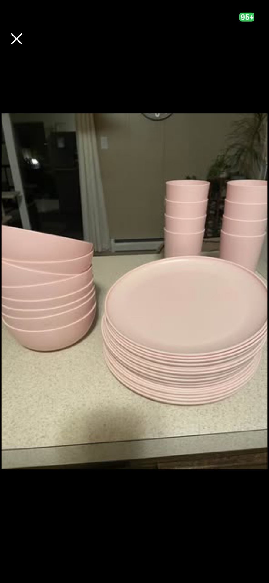 Large hard plastic type dishes there are 17 dinner plates 8 deep bowls and 8 large cups these worked well at our barbecue last year $15