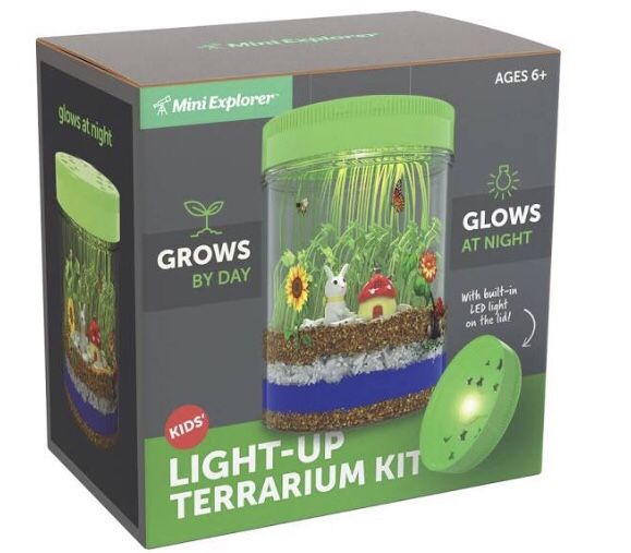 Mini Explorer Kids Light-Up Terrarium Kit. Grows by Day, Glows at night, with built-in LED light on the lid. Makes a great Christmas gift