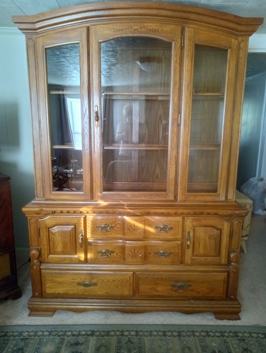 Oak wood finish, 2 glass shelves on the top part of the cabinet. The top half has one glass door that opens. 2 recessed operating lights are at the top inside to highlight contents. The bottom half has 2 compartments with doors on each side. The bottom half also has 4 drawers for storage. The China cabinet has engraved designs and pedestal footing. All handles are metal.