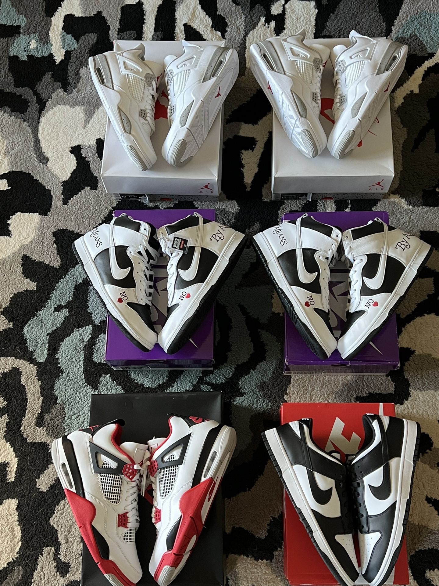 DS Jordan 4 White Oreo Size 12x2 $440 each DS Jordan 4 Fire Red Size 12 $400 DS Supreme Dunk High Storm Trooper Size 12x2 $300 each DS Panda Dunk Size 12 $240 Will only take a trade heavily in my favor ❤️