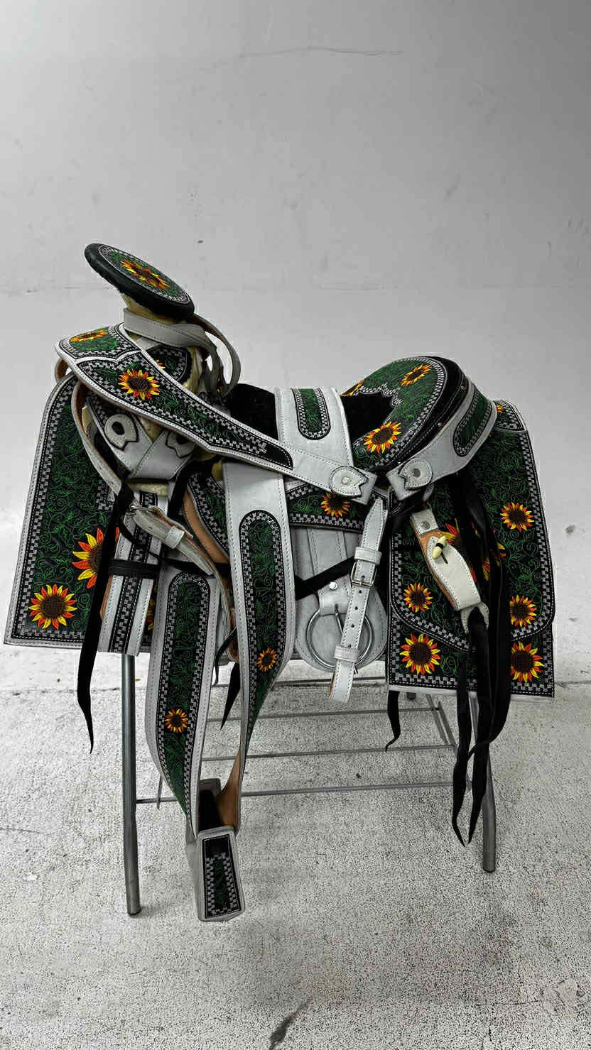 Montura charra bordada de Piel Hecha en México, incluye La cabezada Las correas para las espuelas El cincho y la pechera lista para recoger o entregamos a domicilio