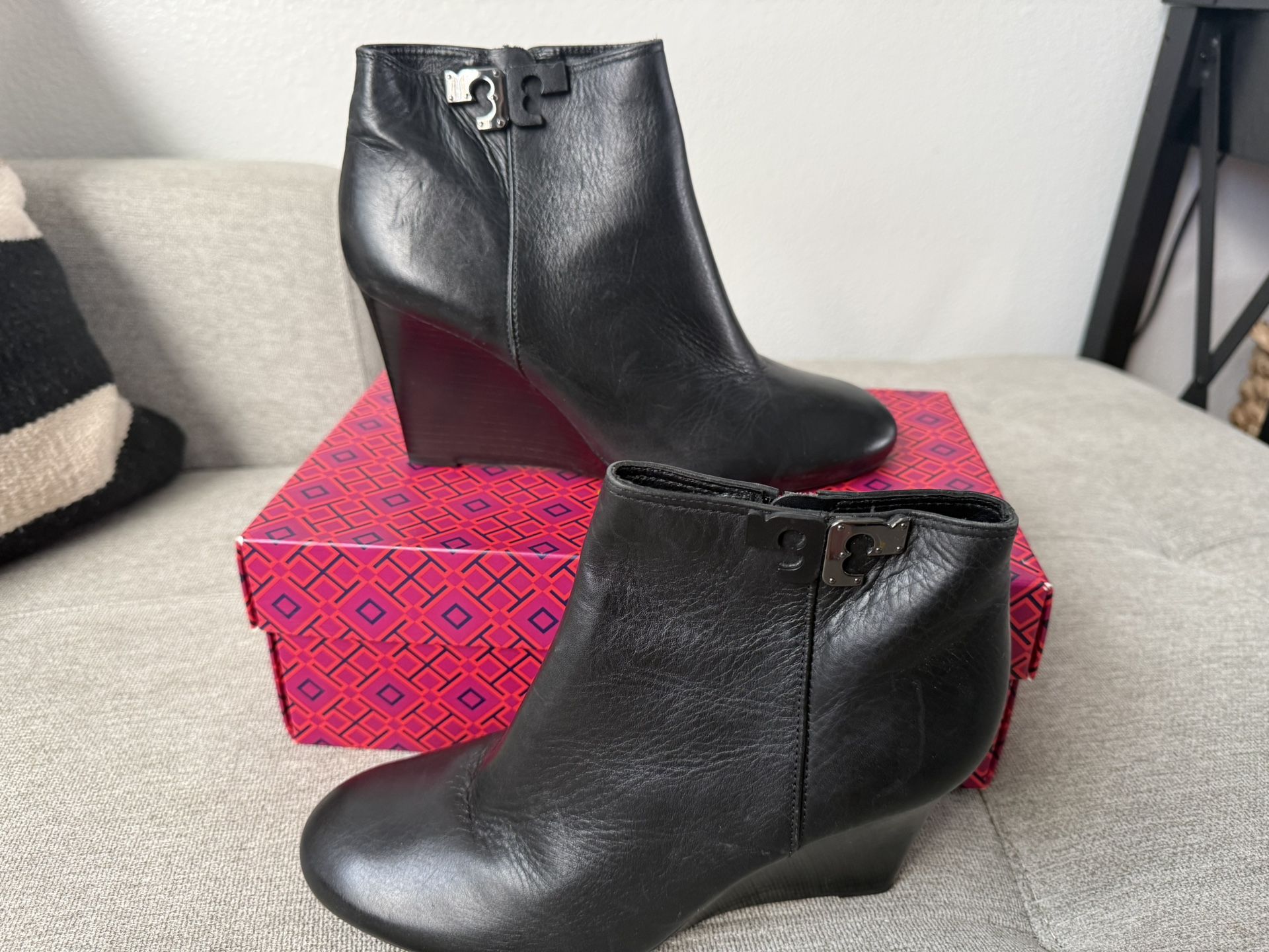 New black tory burch boot. As seen in the pictures the sticker part is what caught dust but other than that they have never been worn. Wedge heel type size 8. Just stored away and want to get rid of them.