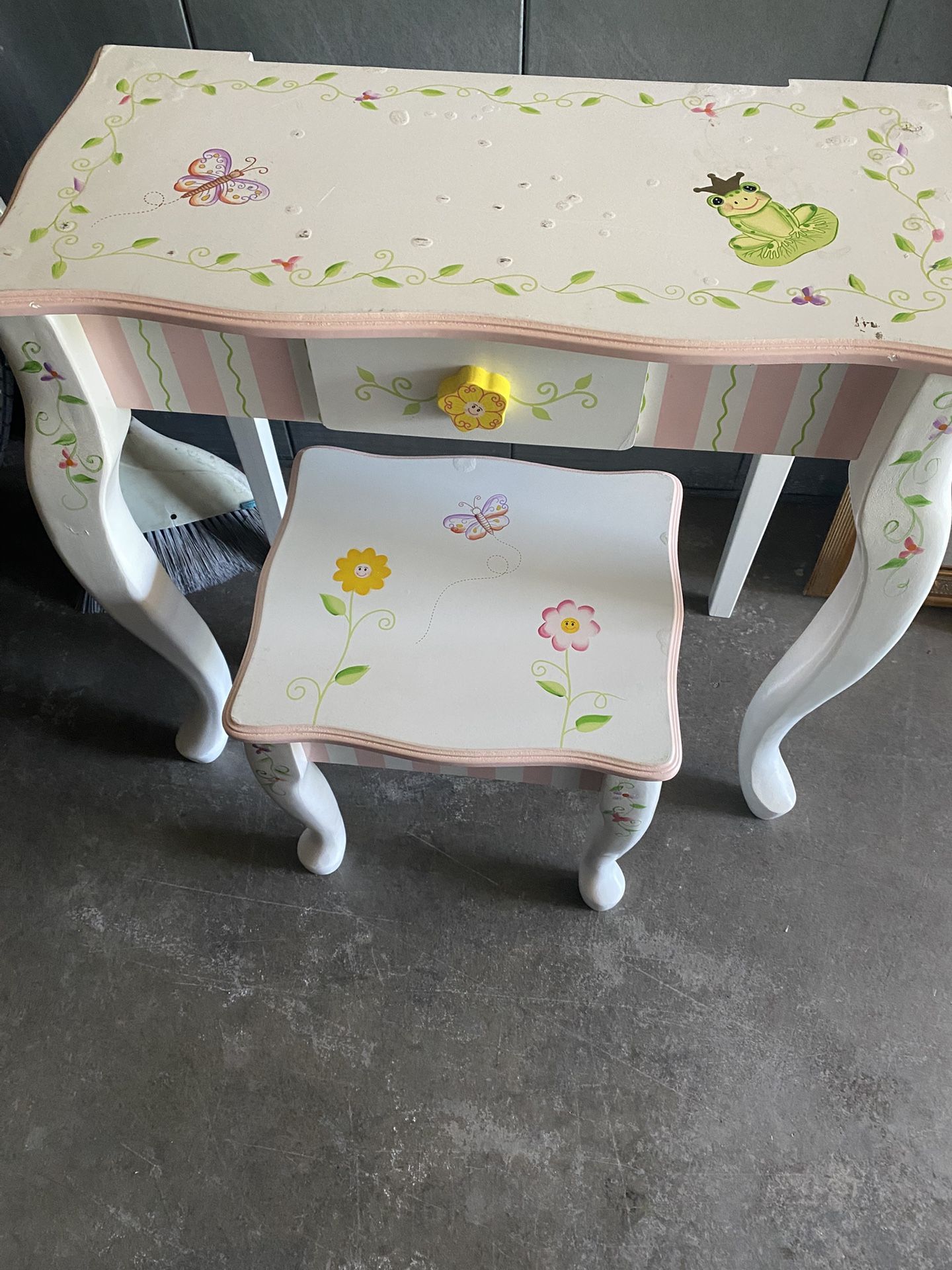 This is a beautiful white girls vanity table with chair. There’s a small drawer in the front very dainty very beautiful. 25 x 25 is the dimension of the table in the chair is 14 x 12.