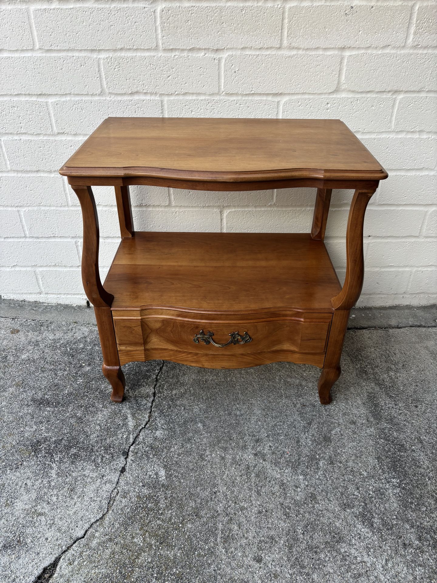 Vintage John Widdicomb French Provincial style wooden 2 tier side table. Excellent condition. Minimal vintage wear. H: 25 inches W: 24 inches D: 16.5 inches