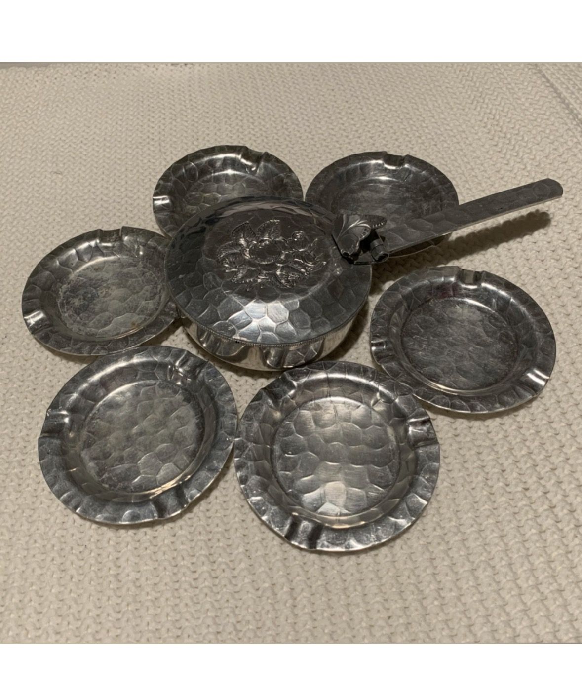 This vintage hammered aluminum set includes six nesting ashtrays housed in an elegant ashtray holder.
