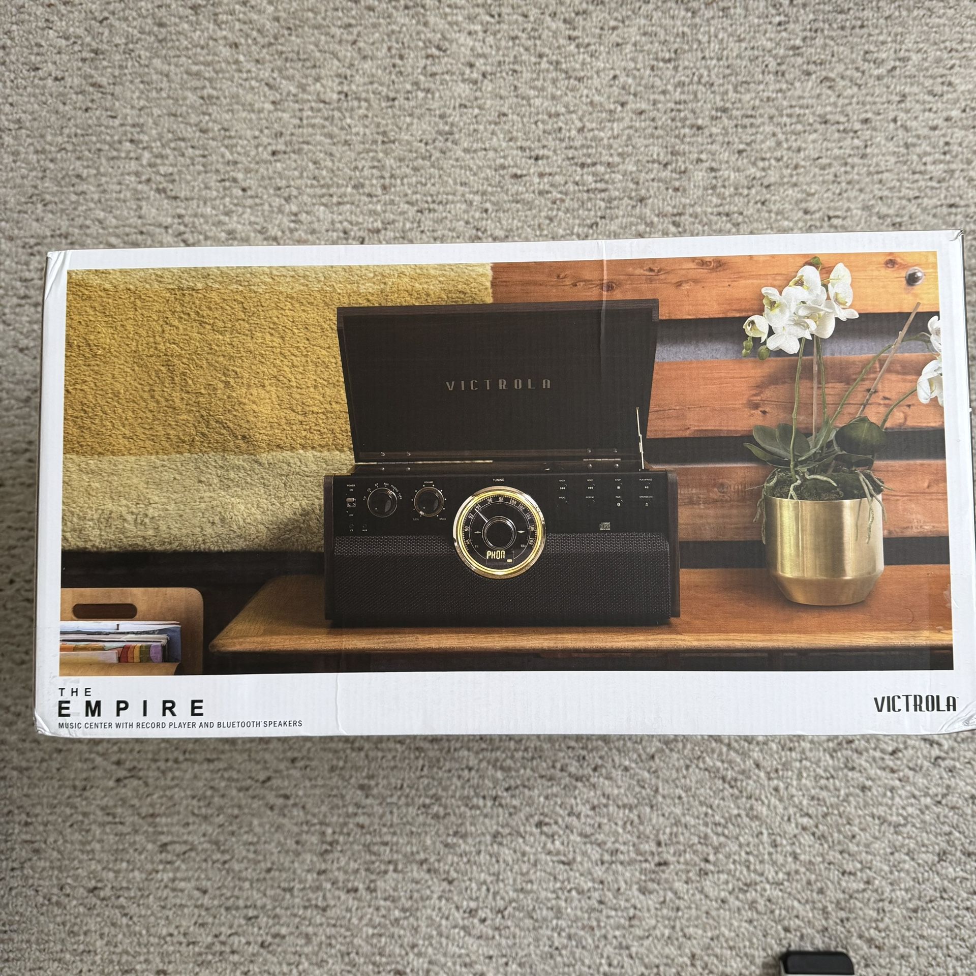 NWT Victrola The Empire Record Player MUSIC CENTER WITH RECORD PLAYER AND BLUETOOTH SPEAKERS 6-in-1 ENTERTAINMENT CENTER - With traditional farmhouse looks on the outside & modern features inside, listen your way; vinyl records, FM radio, CDs, cassettes or stream music from your smartphone via Bluetooth or 3.5 mm Auxiliary/headphone jack NO STEREO SYSTEM OR EXTRA EQUIPMENT REQUIRED - Get it up and running in minutes. Timeless mid-century looks combined with the convenience of modern technology make this record player a great value - ideal for beginners & vintage enthusiasts alike THREE SPEED TURNTABLE - This 3-speed (33 1/3, 45, 78 rpm) record player features built-in stereo speakers that give you well-rounded sound in your home. It is perfect for your living room, bedroom or office and a great choice for vinyl lovers ALL CONTROLS YOU NEED - It has everything you need right there - an analog radio dial in the middle surrounded by LED light and gold accents, input select & volume knobs, music playback buttons & headphone/aux. The front looks clean, uncluttered & simpl $279