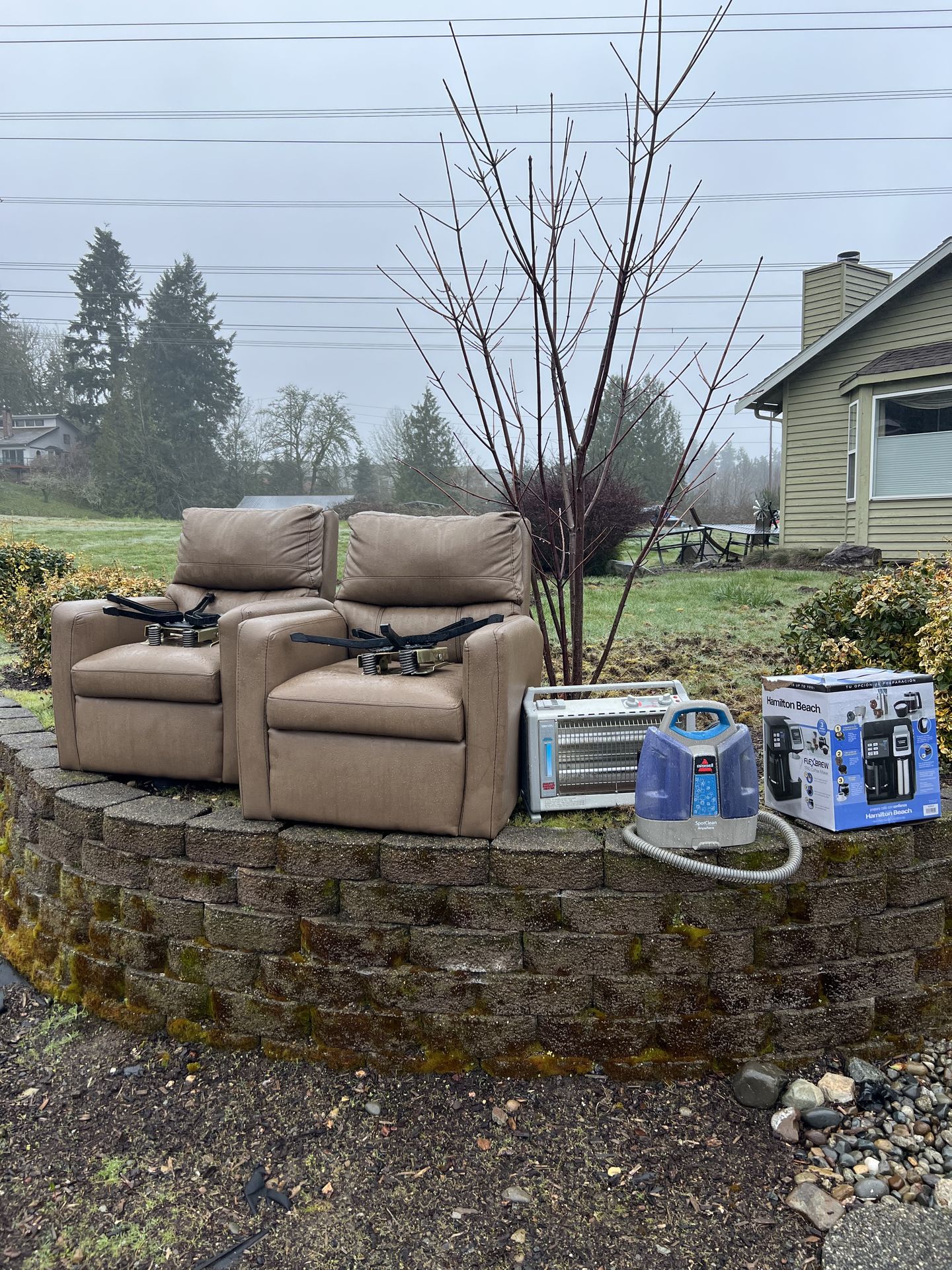 2 leather chairs 1 heater 1 coffee maker Message me and I will send you my address If this post is still up the items are still available. First person to respond take all