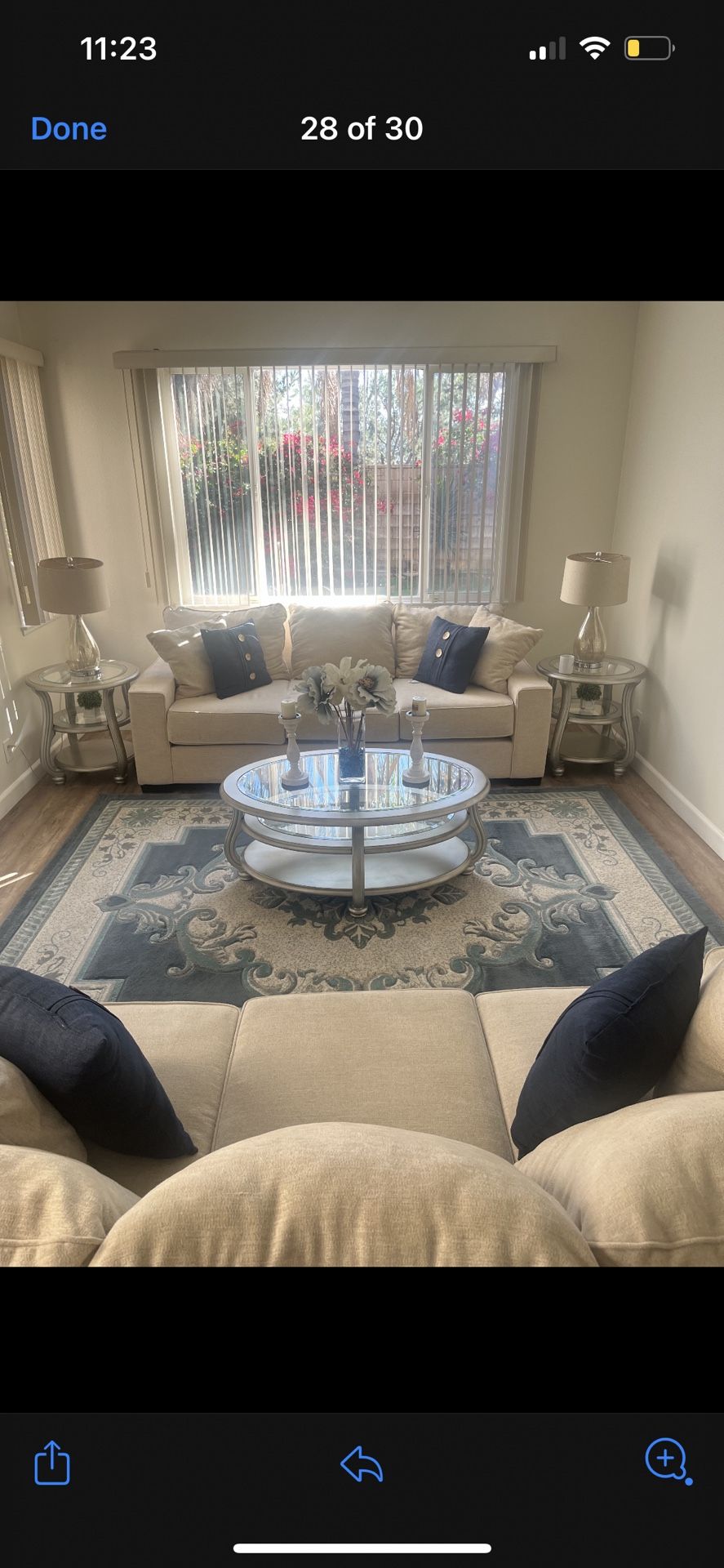 Hi I am selling 3 piece living room furniture what coffee table 2 end tables a total of six pieces the chairs we bought them at Moores furniture Derstine resistance they’re in excellent shape we had no pets non-smoking everything must go We paid $3500