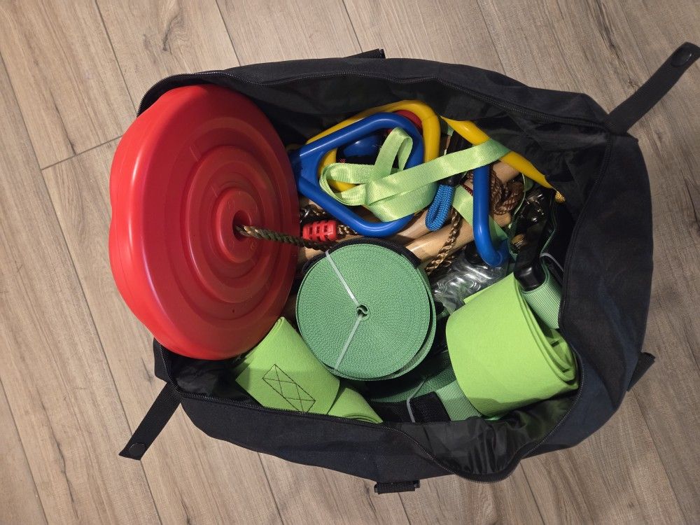 Completely unused, slack line activity set for kids. Comes with lots of swings things and gym stuff. Needs 2 posts or trees to set up. Amazon selling for 190