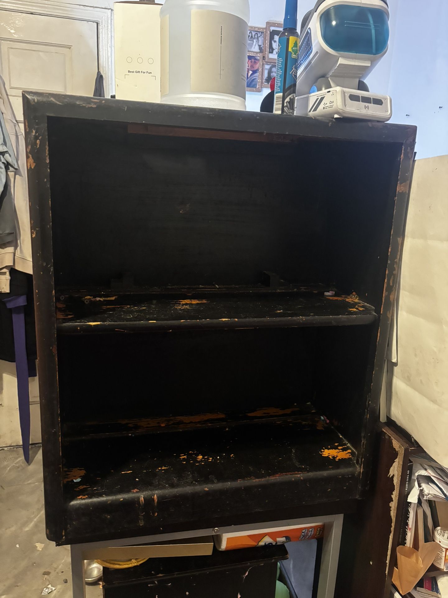 Black small shelf for shoes , or use of storage or book shelf . Still in good condition ! very sturdy wood ! Might need a re paint perfect for a diy project! Or not
