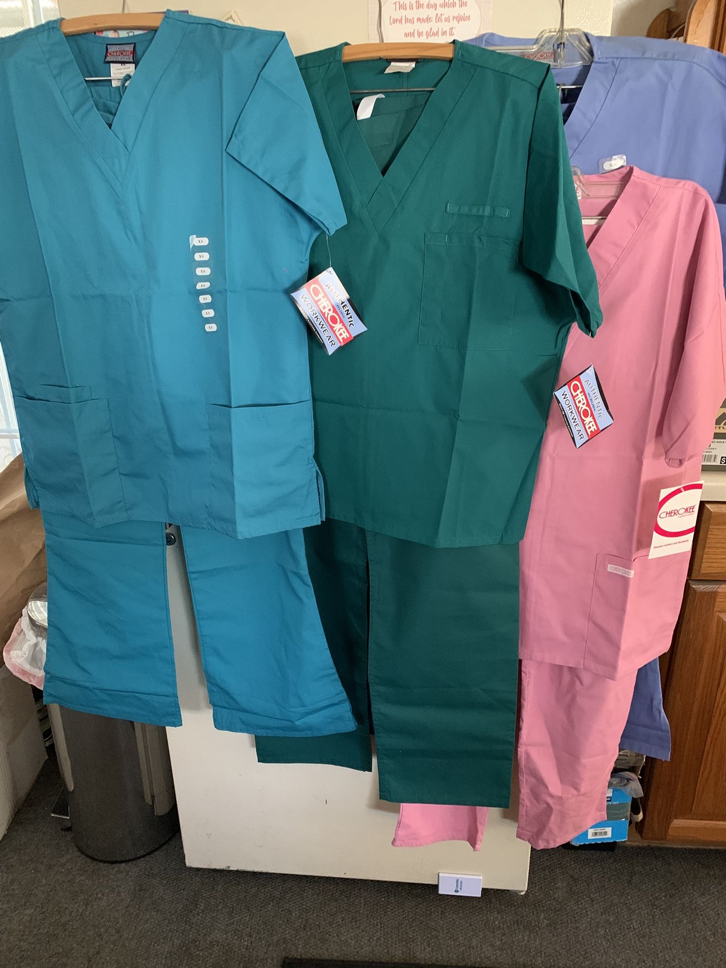 NEW PLUS SIZE SCRUBS $5.00 each or $10.00 per set Sets available are: Teal. = 3X. 1 set Lime Green = 2X. 4 sets Purple = 3X & 4X. 2 sets of each Ceil Blue = 3X 1 set Pink= 2X. 1 set Navy = 2X. 2 sets Red= 2X. 2. sets & 1 set in Large White = 2X. 2 sets Other sets available in sizes: XS, SM, Lg Scrub tops & bottoms available in 13 colors WHITE& BLUE Dr. Shirts in photos are in sizes: 48 to 56 Tap on my profile photo for more items I have posted Chino, ca 91710 71 freeway at chino avenue