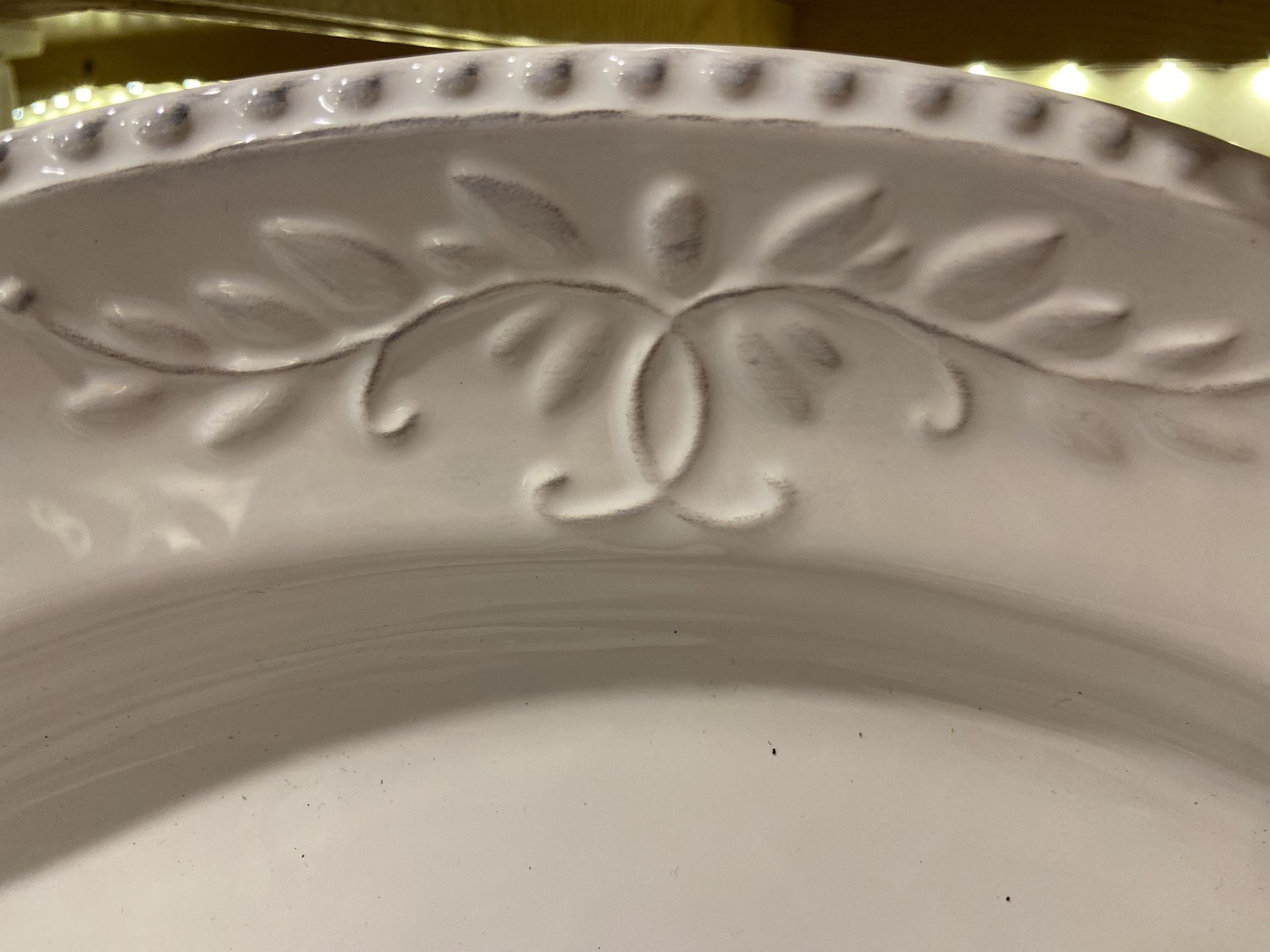 Includes everything in photos, (19 items) all in good used condition. Two large serving bowls, large platter, 3 tier dessert tray, 3 serving trays with triple bowls, 10 plates, faux orchid & “fall” wood decor. Selling as a set only.