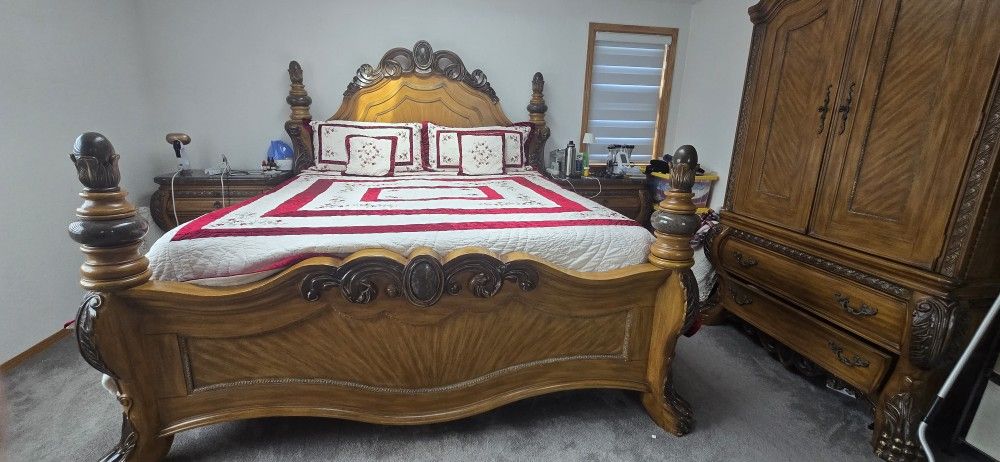 King Size Bed, 2 Night Stands, Dresser With Mirror And Armoire. All Solid Wood