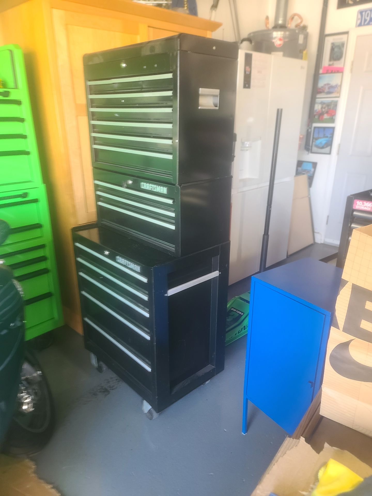 Beautiful, black Craftsman.\nRoll away toolbox