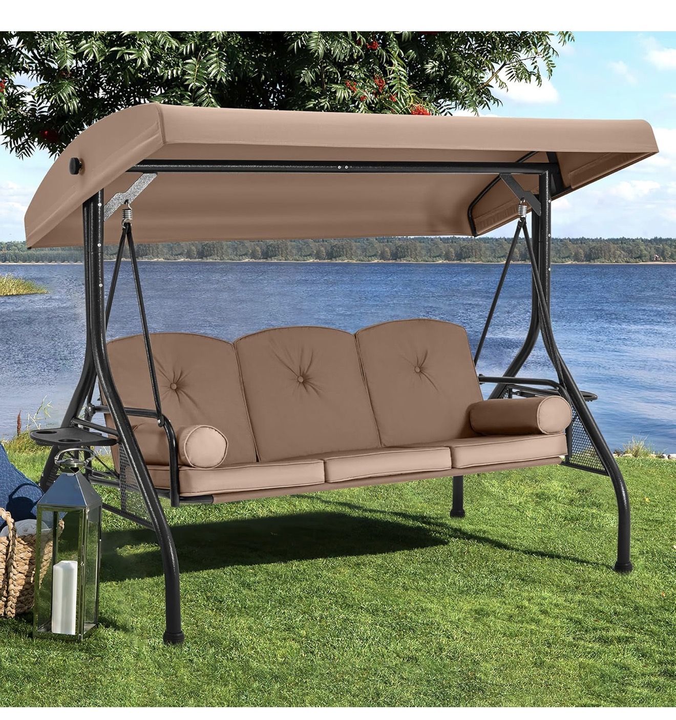 New in box Ps13cb-n025 HOMREST 3 Seat Outdoor Porch Swing with Adjustable Canopy, Convertible Patio Swing Bed with Stand, Patio Glider Swing with Upgraded Cup Holder, Thicken Cushions & Pillow for Backyard (Brown)