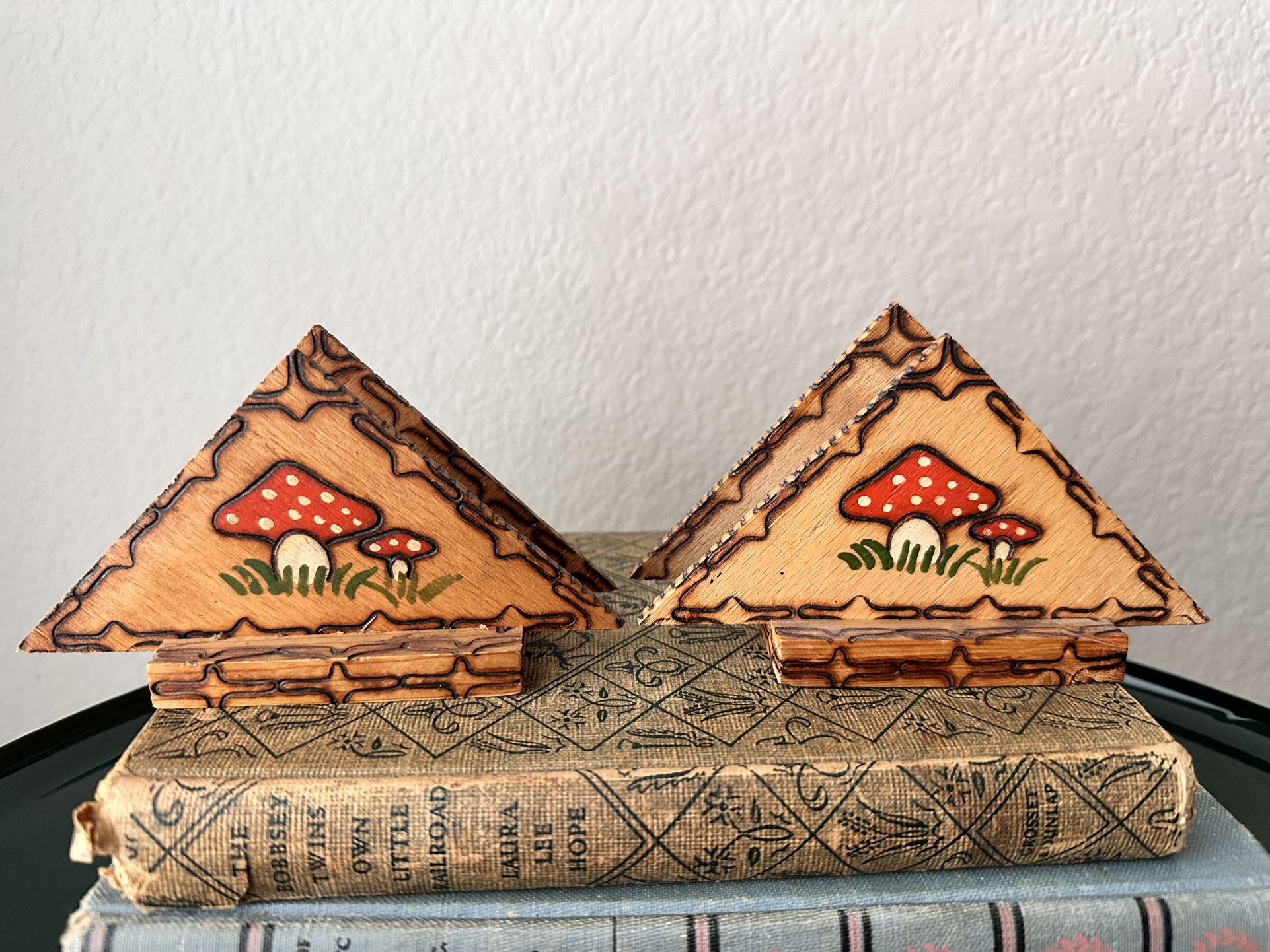 Super cute vintage wooden napkin holders Made in Russia Triangular design with hand-painted red-capped, white-spotted mushrooms and green grass accents. The edges and base show decorative pyrography (wood-burning) patterns. Set of 2 ‼️Price is FIRM‼️ Door pickup in North Pflugerville only! Cash or Venmo (Friends/Family) accepted.