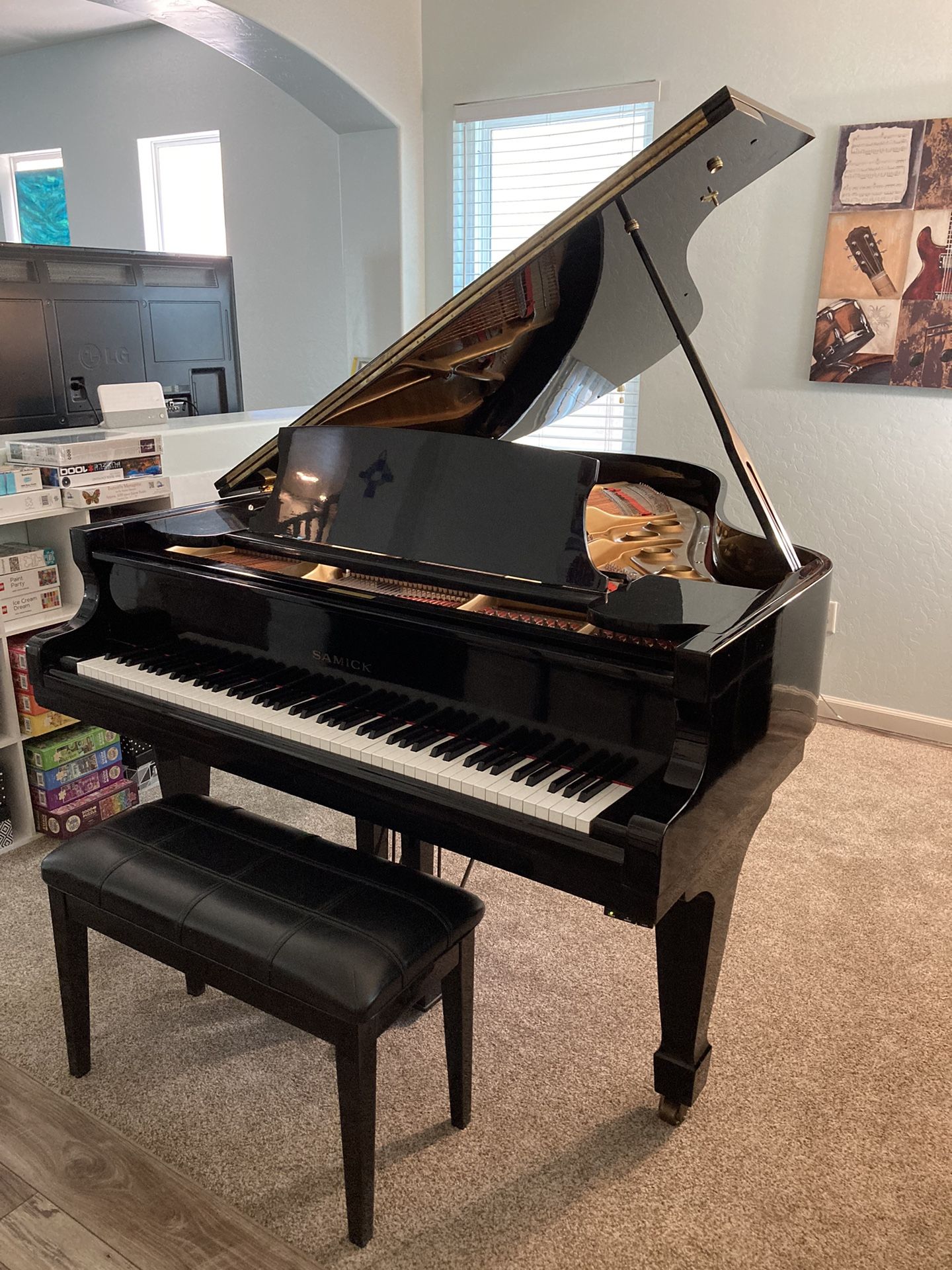 1987 Samick Grand G-5A in Ebony Serial # 832464 7 ft long x 5 ft wide Damp-Chaser system installed Professionally maintained Tuned summer 2023 Small area of cosmetic damage (see 3rd photo) We will pay for moving (local) and re-tuning if our piano mover and tuner are used. Owner willing to finance with a $5k down payment. My husband will also accept Silver or Gold coins as part of the payment.